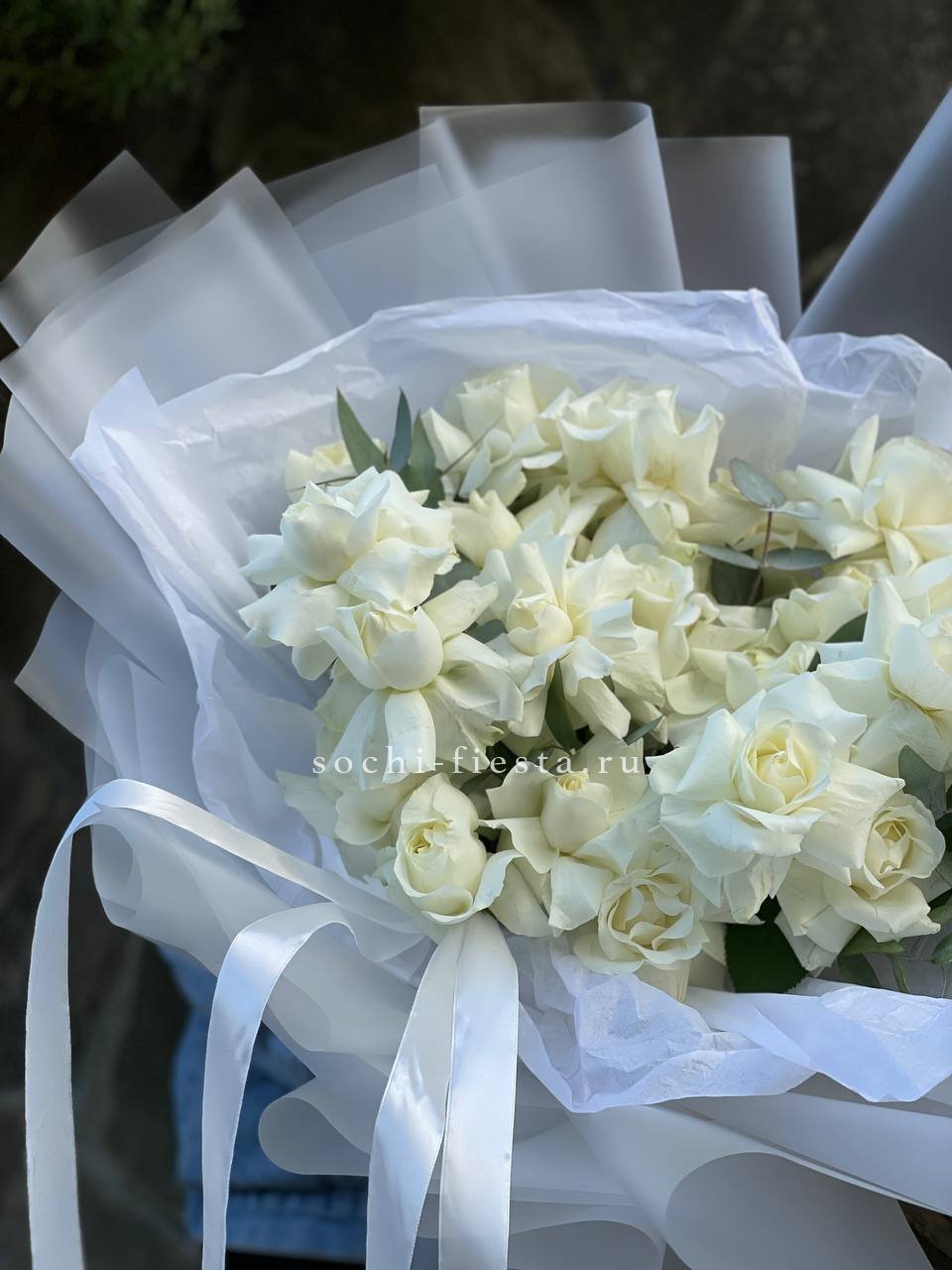 французские розовые розы., лимониум, эвкалипт, лента, дизайнерская пленка. На фото представлен букет из 11 роз.