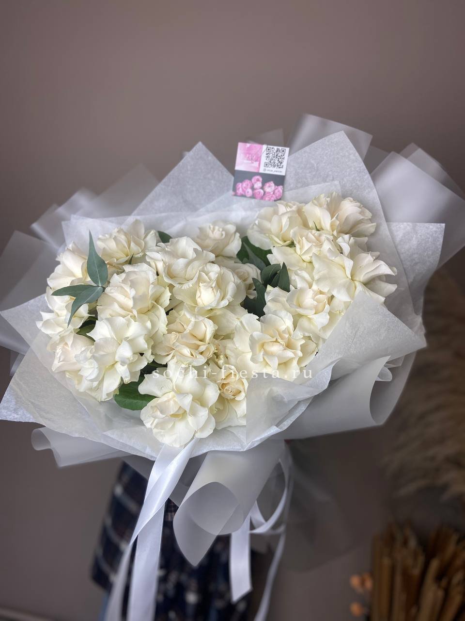 Французские розы распускаются мягкими облаками пудрового оттенка. Лимониум добавляет воздушности, а эвкалипт создает свежую основу. Букет собран так, что каждый бутон виден и дышит.