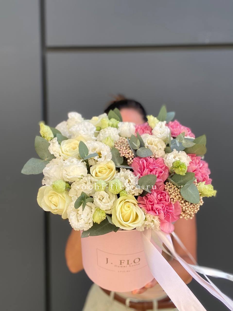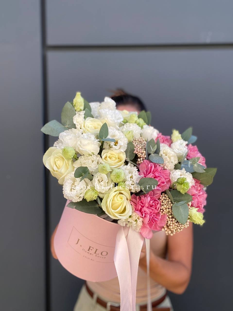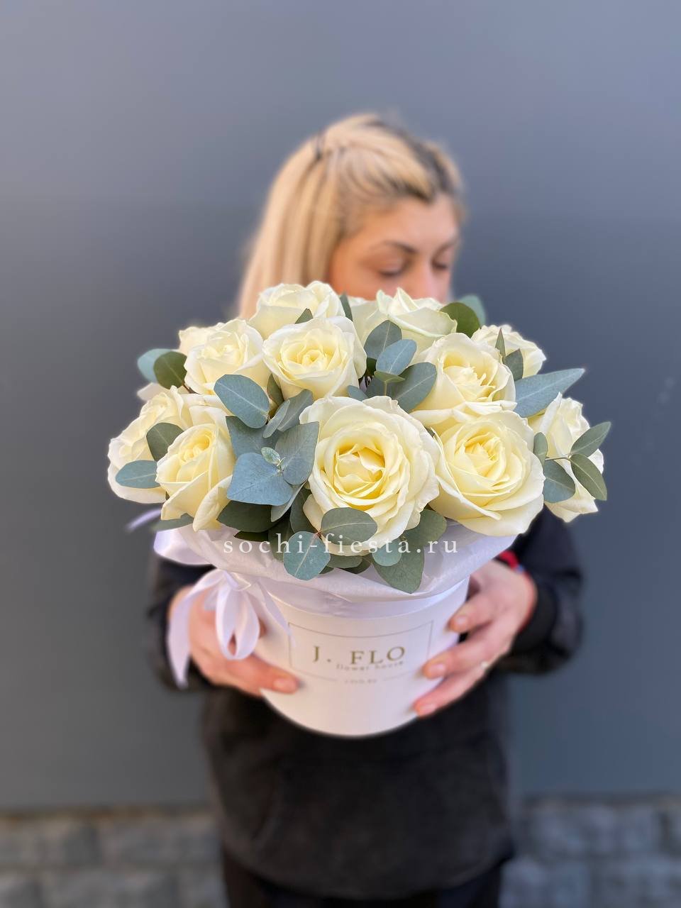 Пятнадцать белых роз собраны в компактный бокс с ветками эвкалипта. Чистая форма и спокойная гамма создают ощущение воздуха и света в любом пространстве.