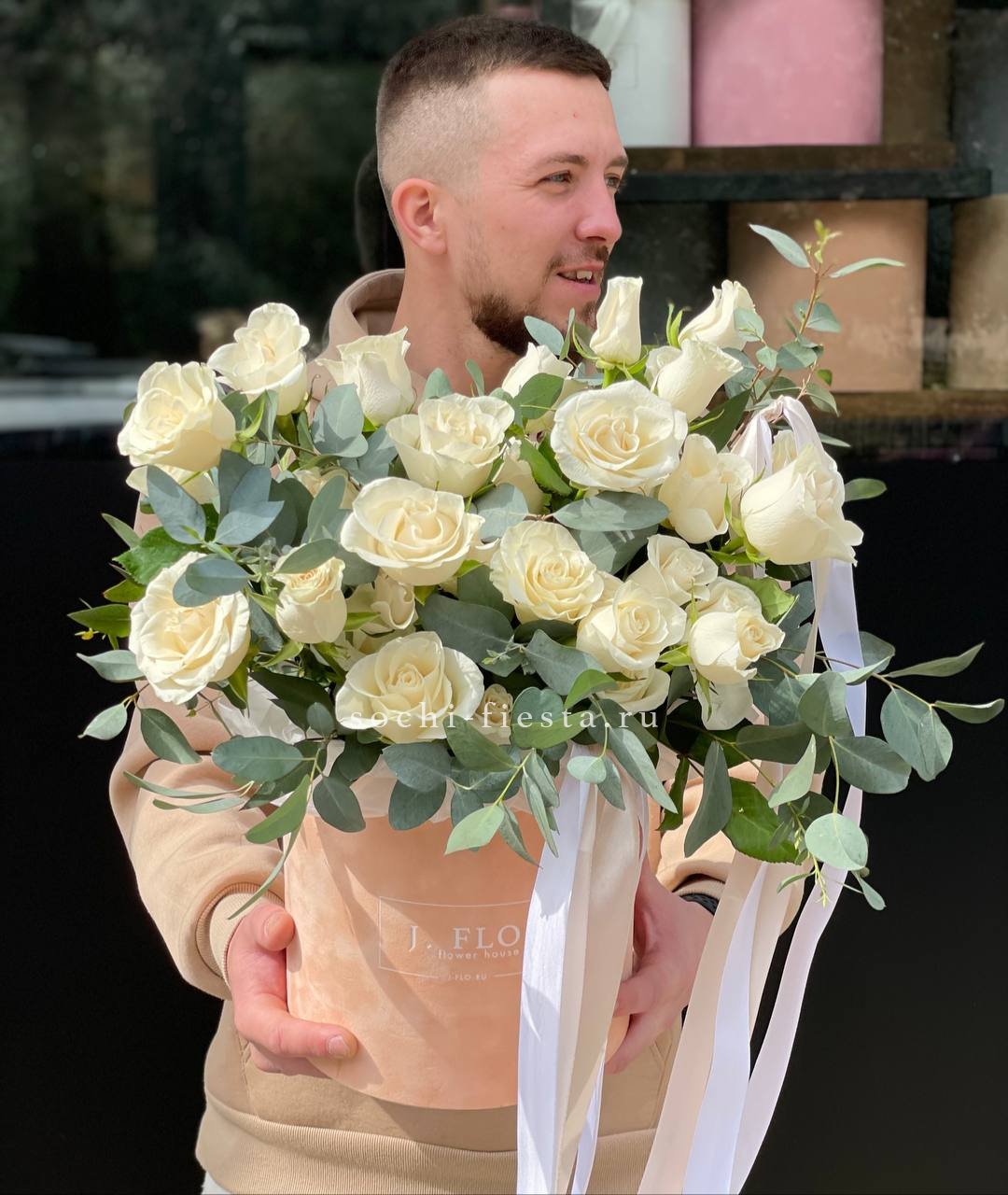 белые розы, цилиндр D20, эвкалипт, лента, упаковка.