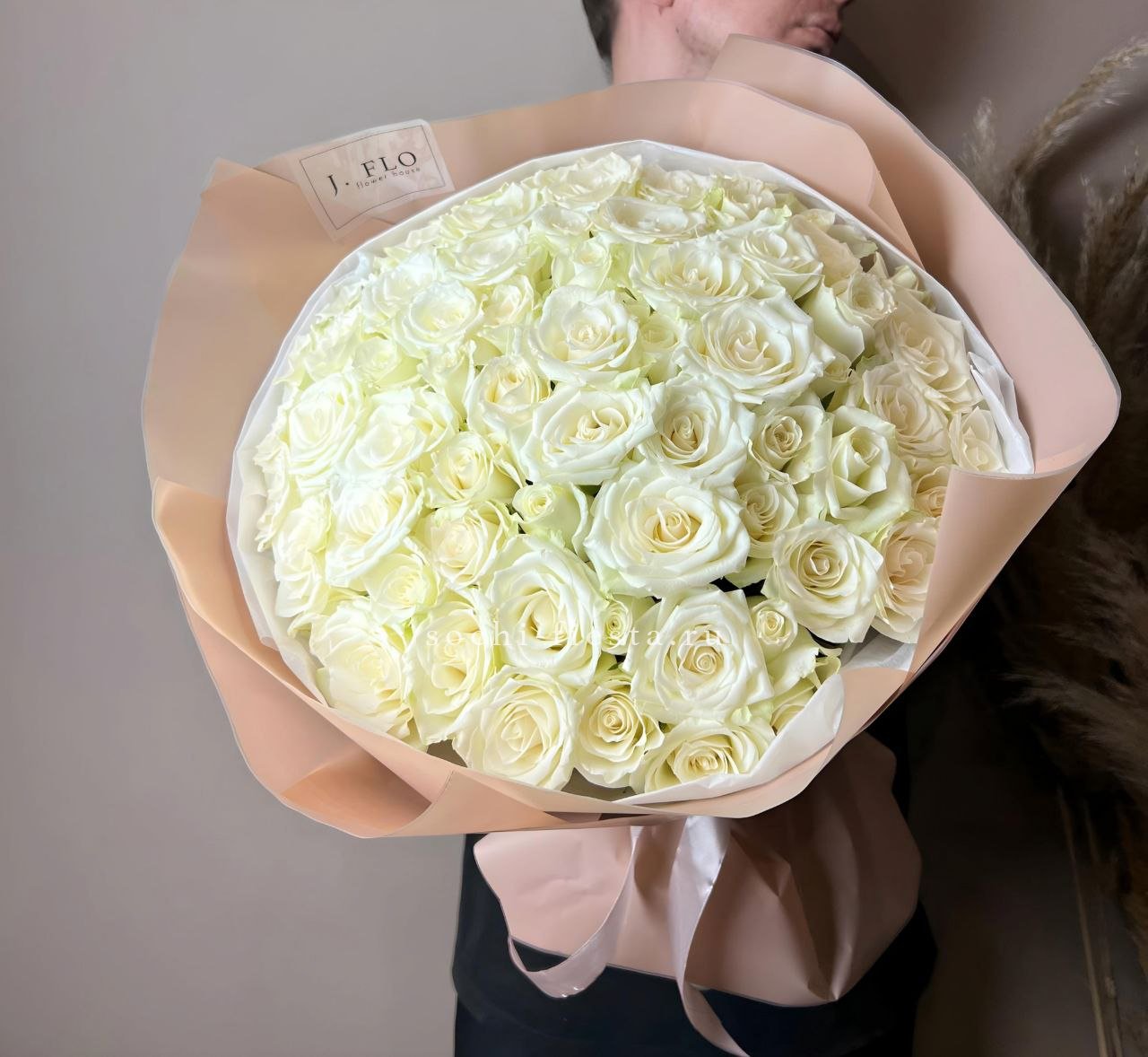Пятьдесят один бутон в лаконичной упаковке из тишью и плёнки. Белые розы образуют плотный купол, где каждый цветок находит своё место в общей структуре букета.