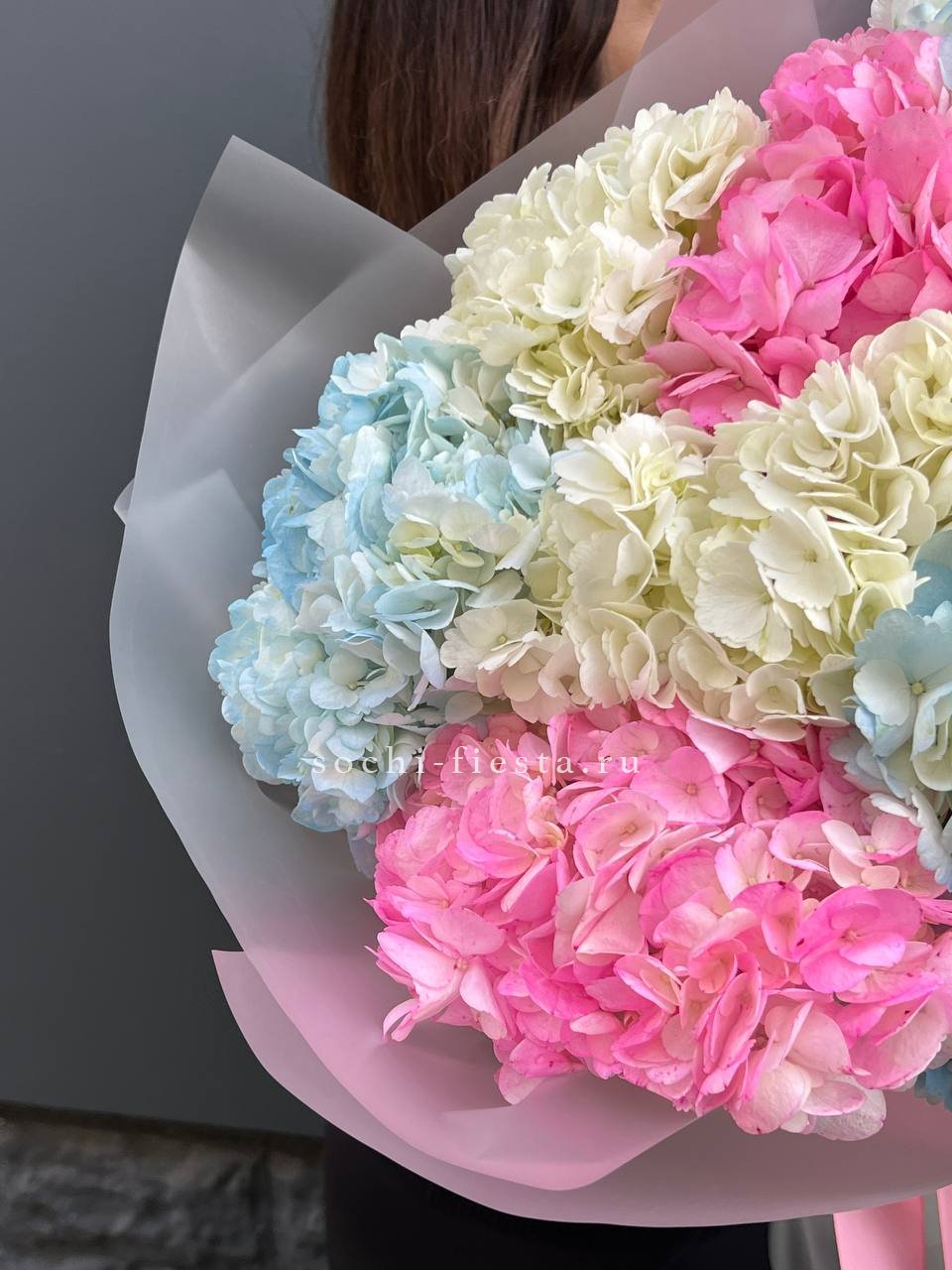 Девять соцветий в разных оттенках создают живую игру между прохладными и тёплыми тонами. Розовые, голубые и лавандовые головки чередуются, рождая динамичный визуальный ритм.