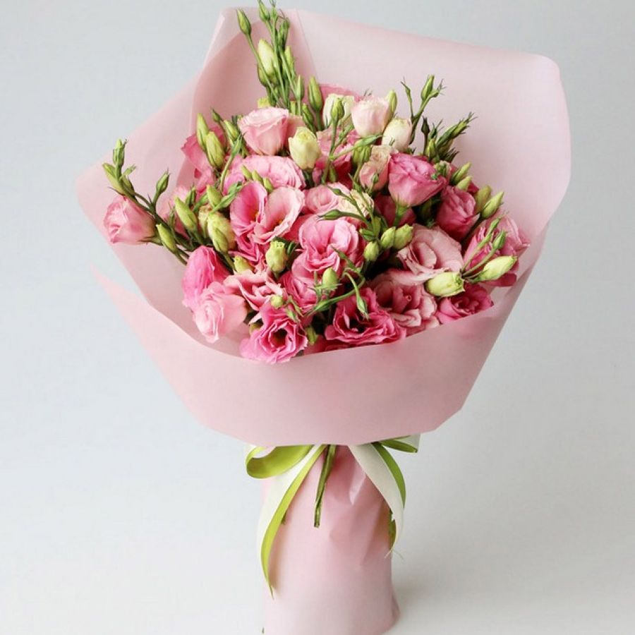 диантусы, розовые розы, гортензия, эвкалипт, вспомогательные цветы, лента, корейская пленка.