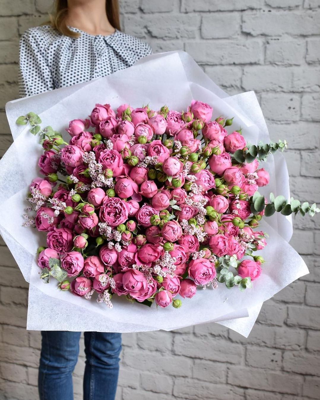 гортензия, эустомы, кустовые розы, одноголовая роза, эвкалипт, вспомогательные цветы (зависит от сезона), тишью, лента, авторская упаковка.