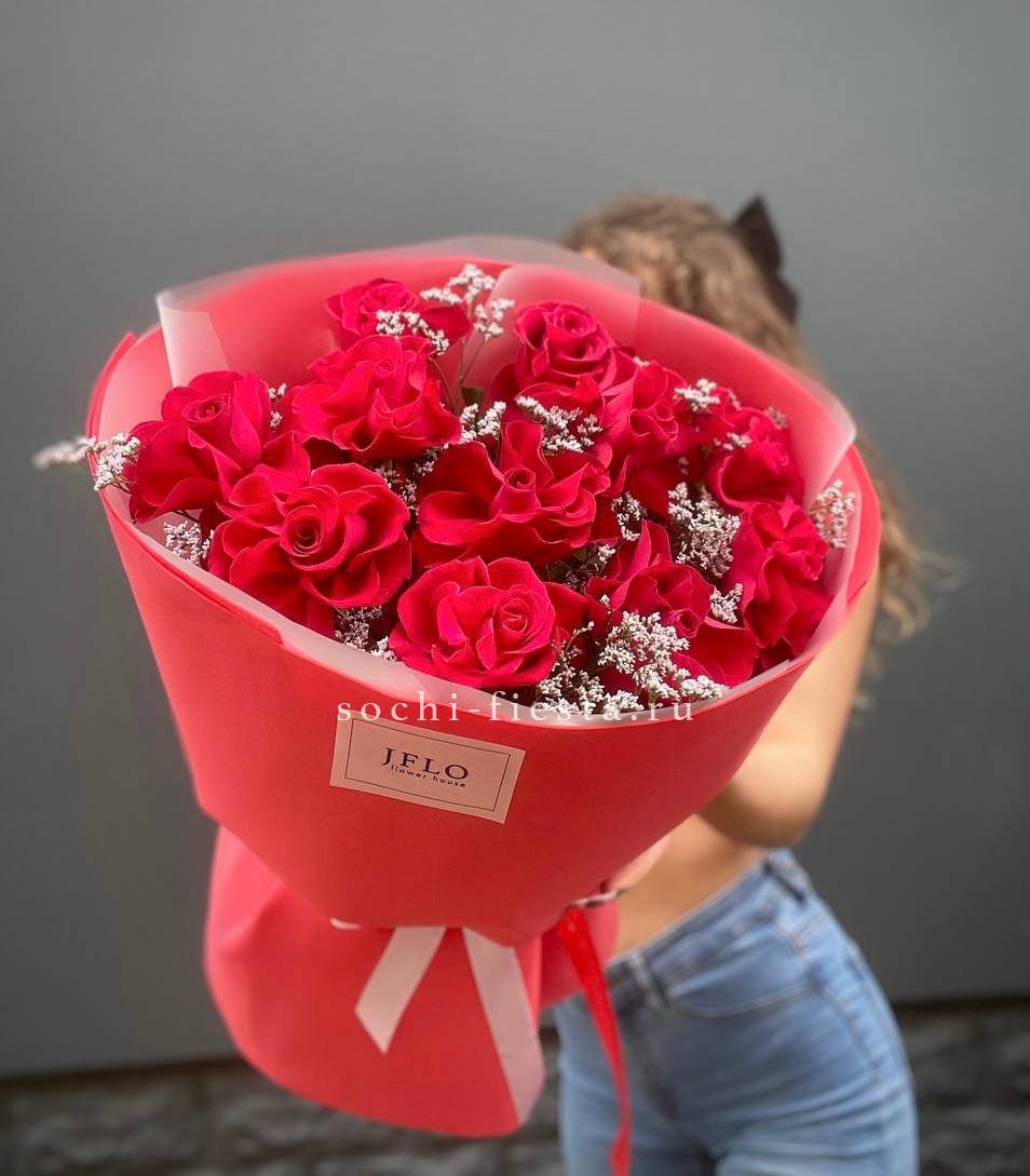 Одиннадцать алых бутонов собраны в плотную вертикальную форму с добавлением воздушного лимониума. Букет держит линию и создает яркое присутствие в любом пространстве.