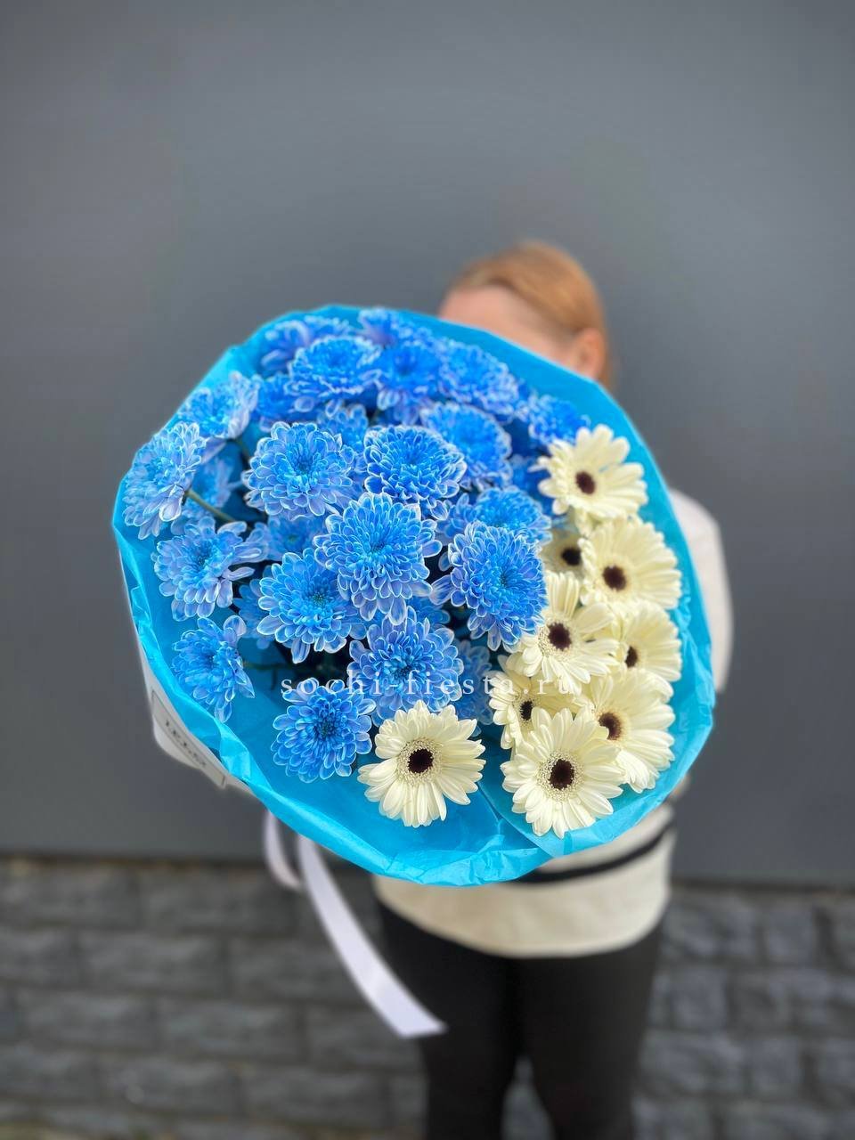 Яркие герберы и пышные хризантемы собраны в жизнерадостную композицию. Букет держит форму и долго радует свежестью, удобно размещается в любой вазе и не требует сложного ухода.