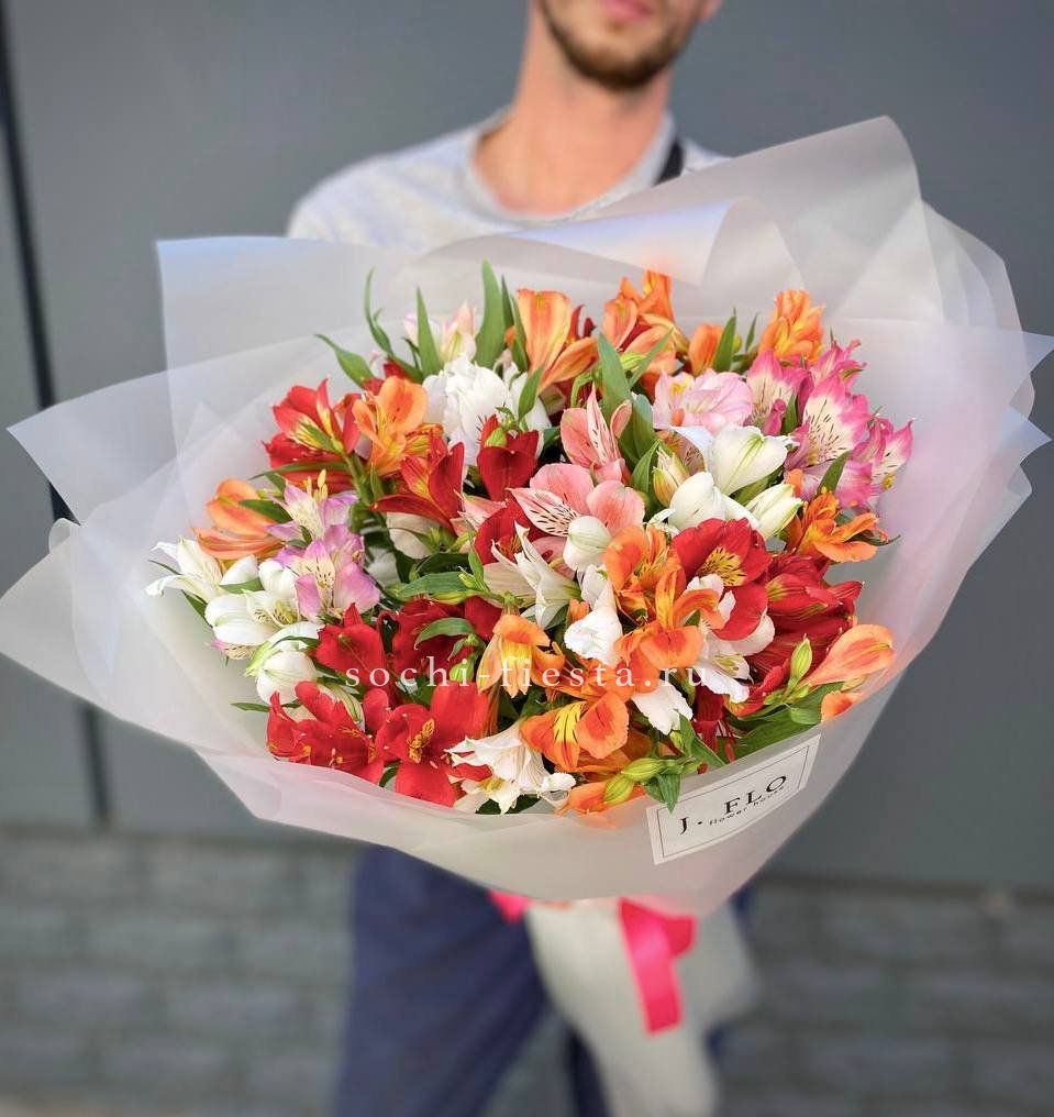 Двадцать одна ветка альстромерии образует плотный объём и насыщенную игру красок. Многоцветные соцветия распускаются волнами, создавая живописное движение внутри композиции.