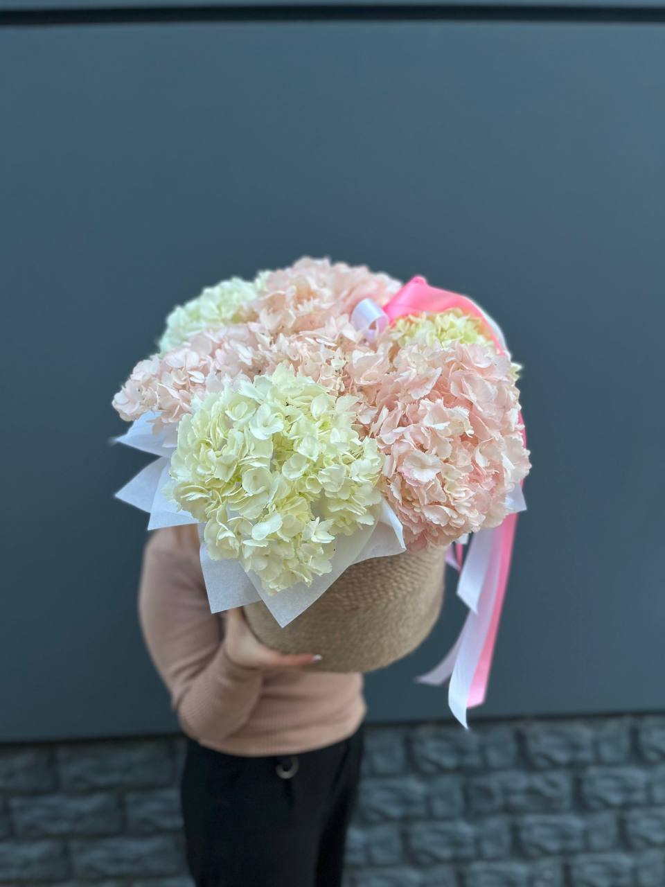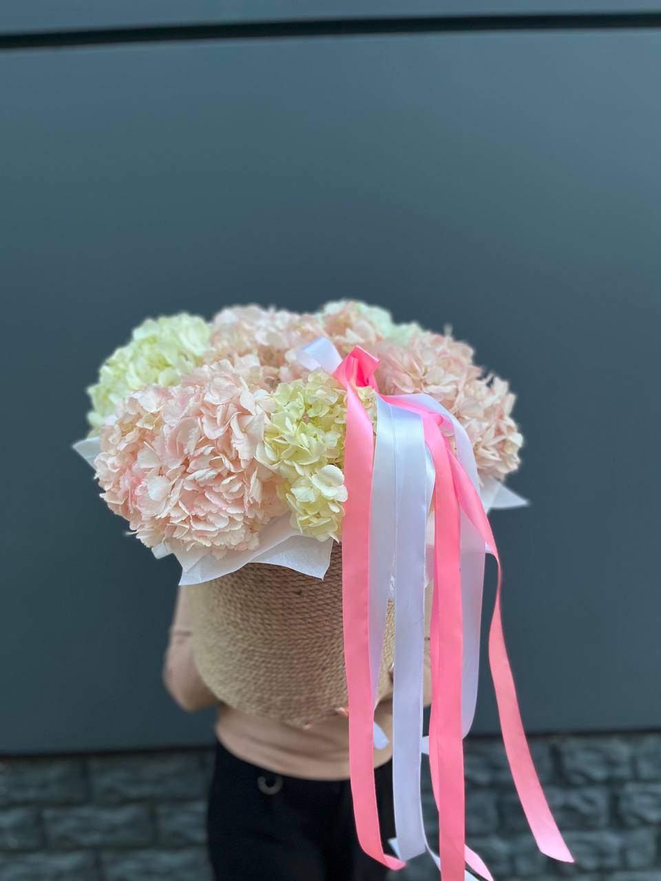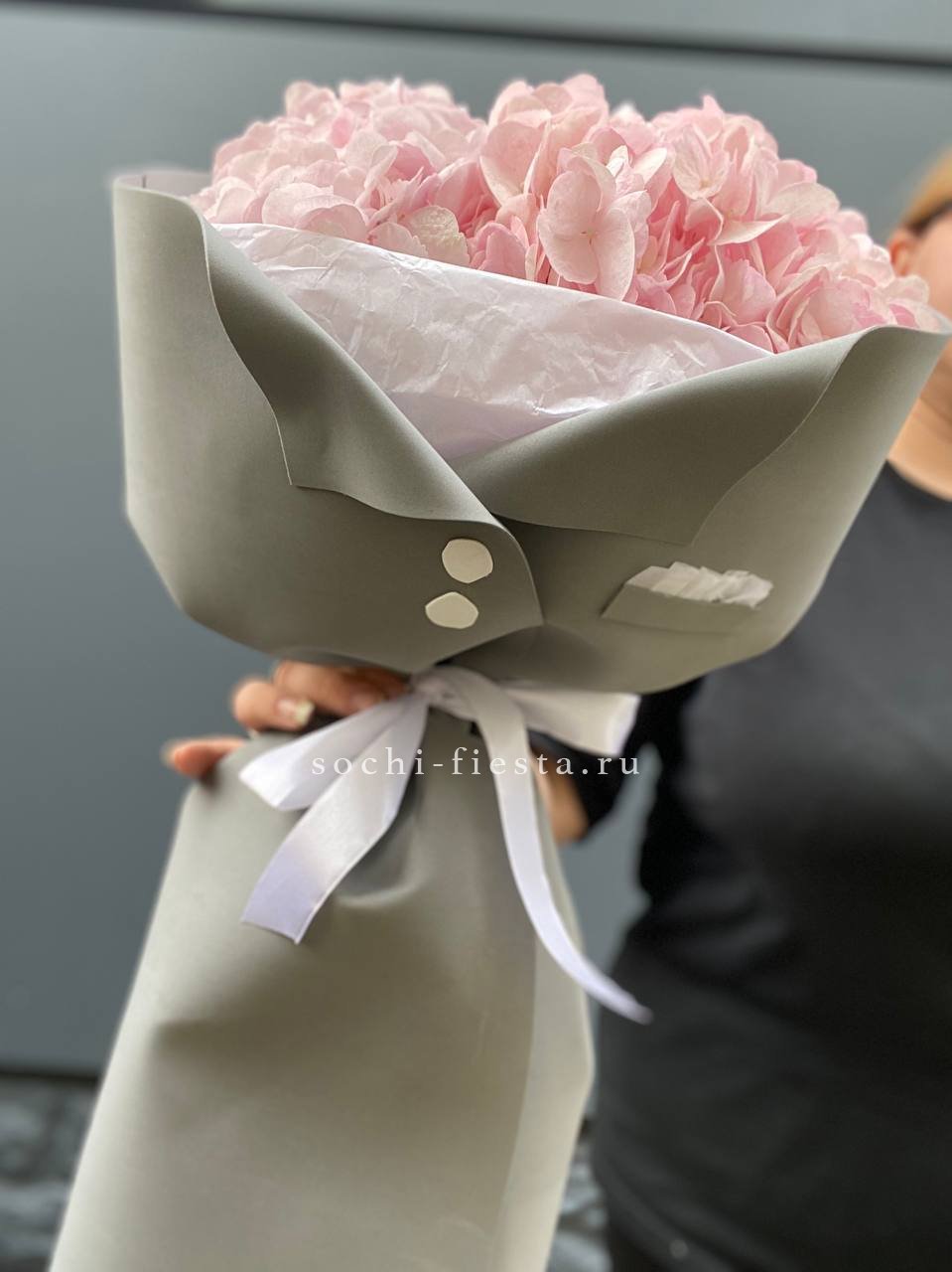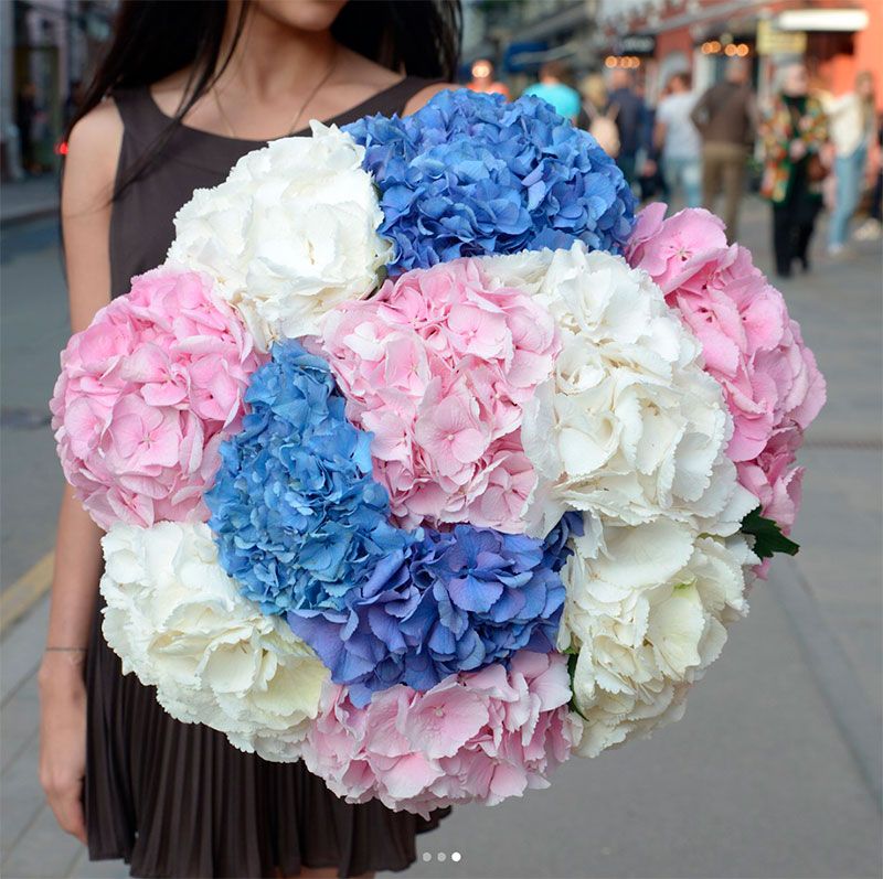 Пять соцветий гортензии в оригинальной упаковке-пиджачке. Необычная форма подачи превращает классический монобукет в яркий акцент для торжественного момента.