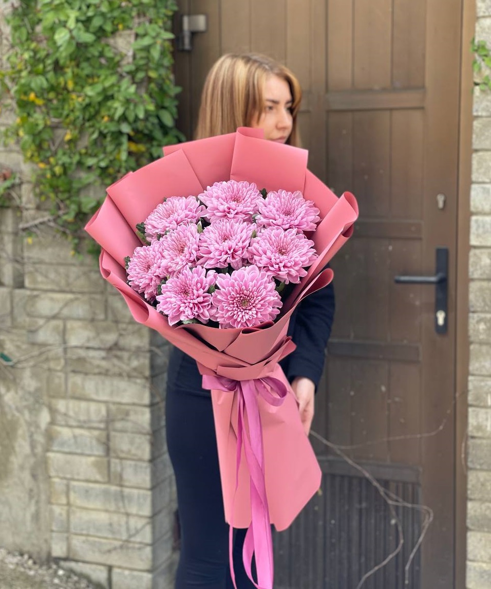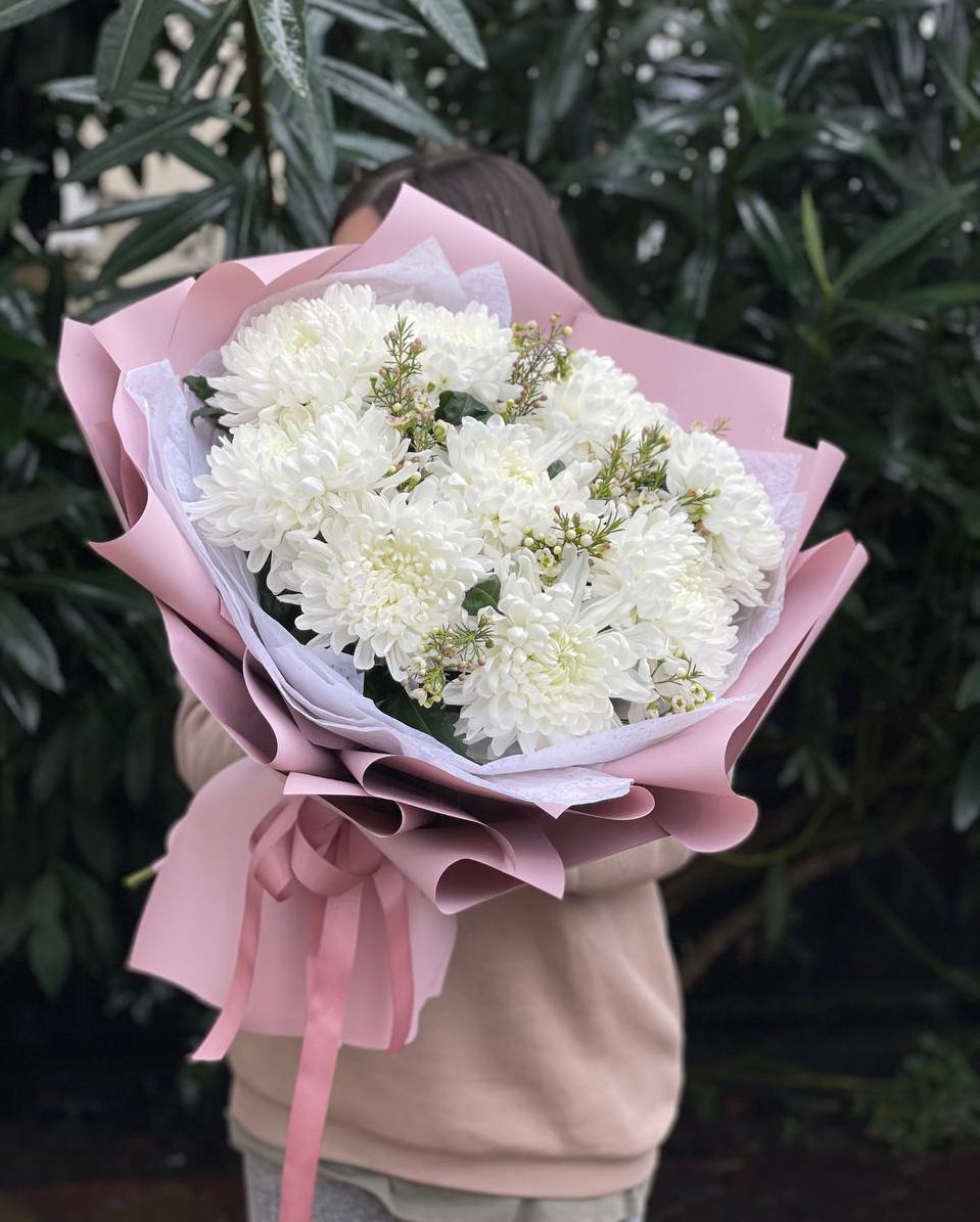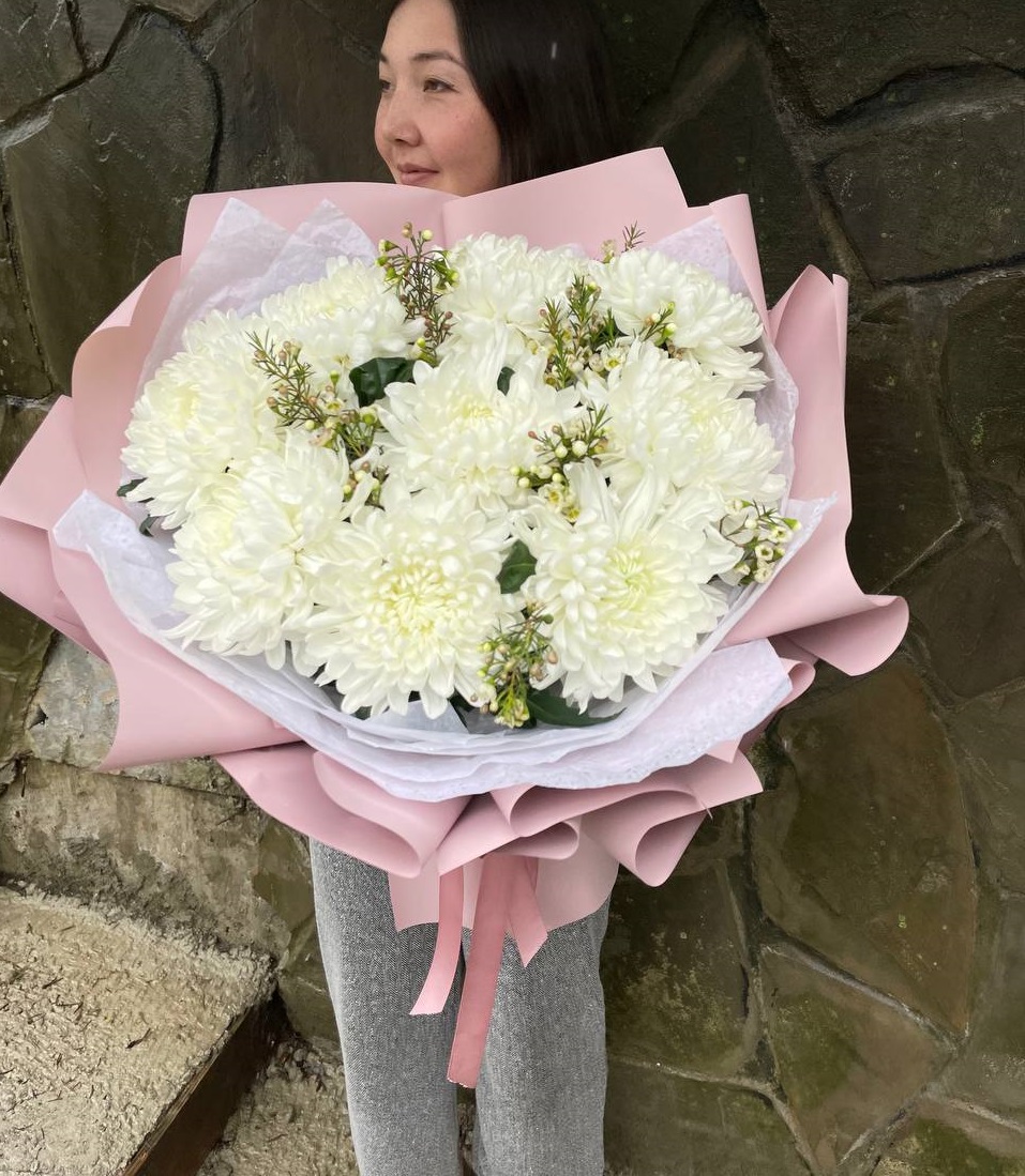Семь пышных хризантем с коробочками хлопка собраны в мягкую композицию пастельных оттенков. Воздушная сборка и естественные линии создают ощущение легкости. Букет для тихих встреч и теплых слов.