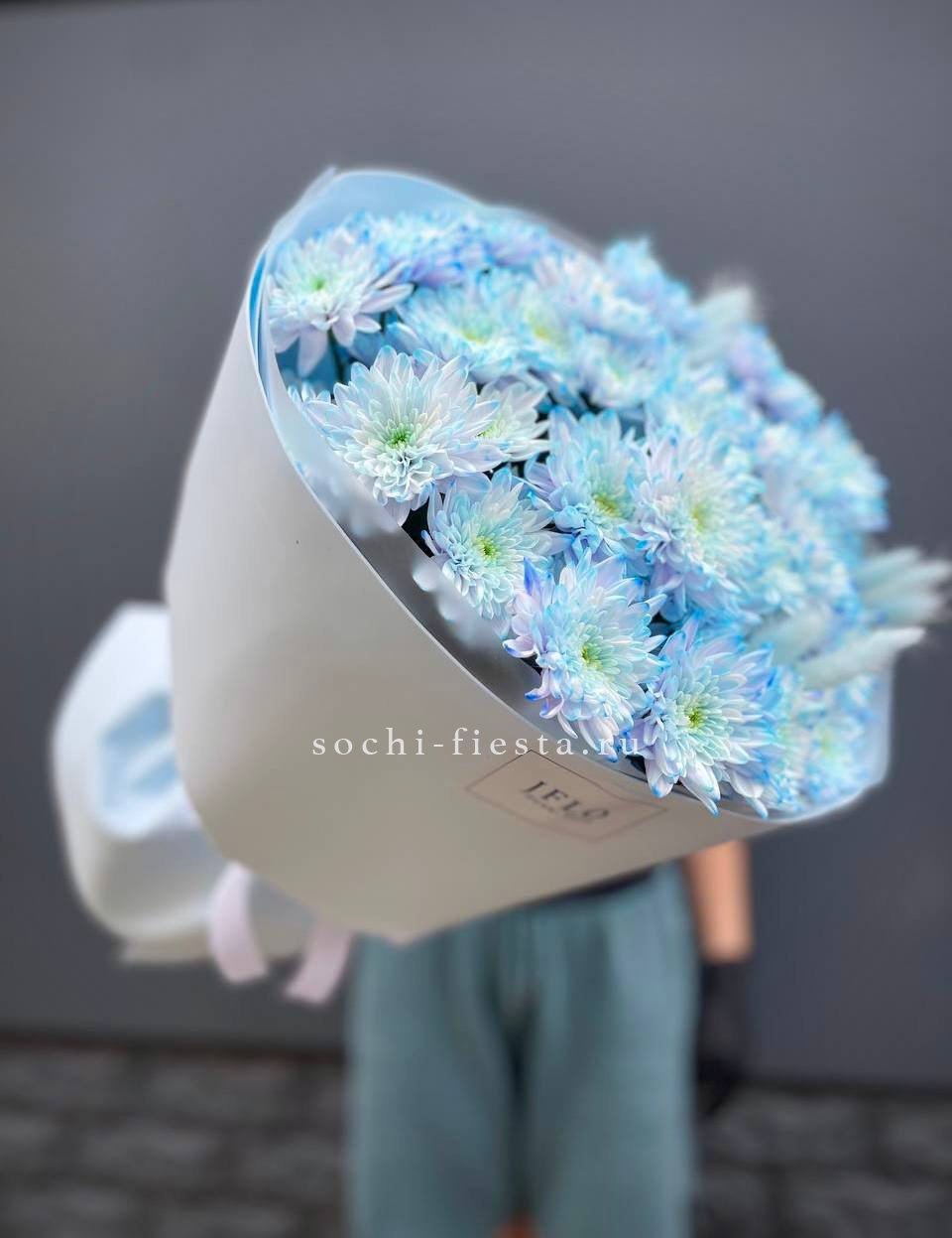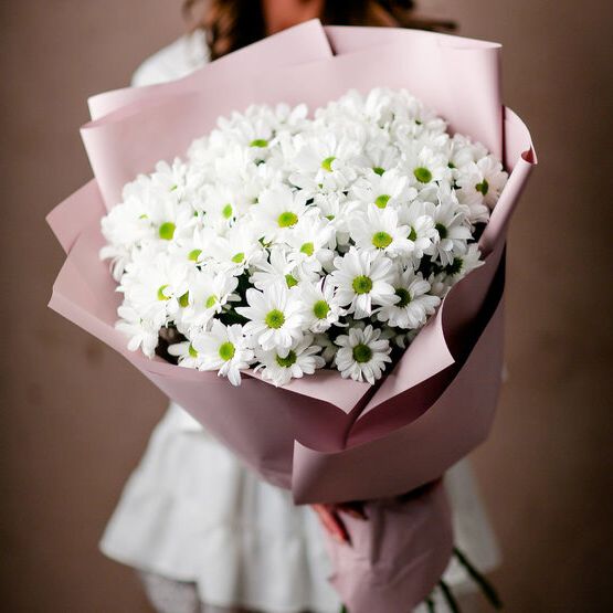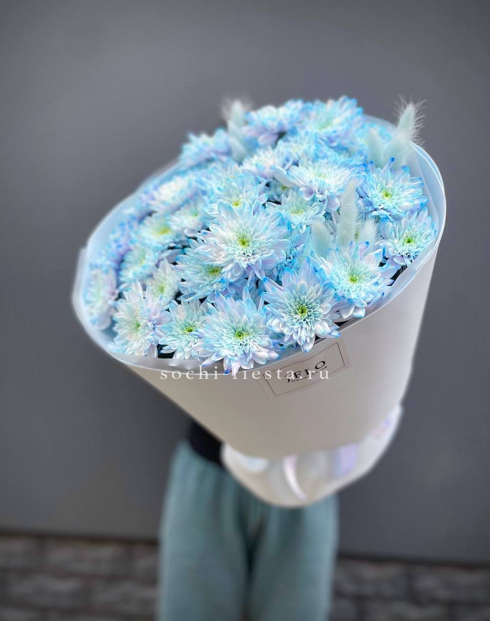 Девять хризантем бигуди выстраиваются в воздушную композицию с игольчатыми лепестками. Каждый бутон раскрывается лучистой звездой, создавая объёмную фактуру и динамичный силуэт.