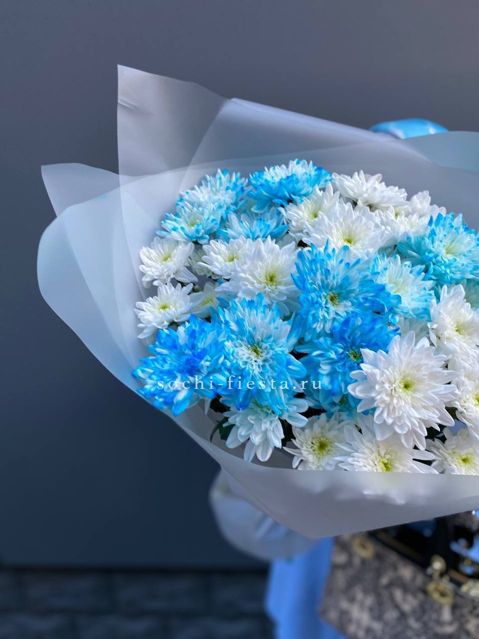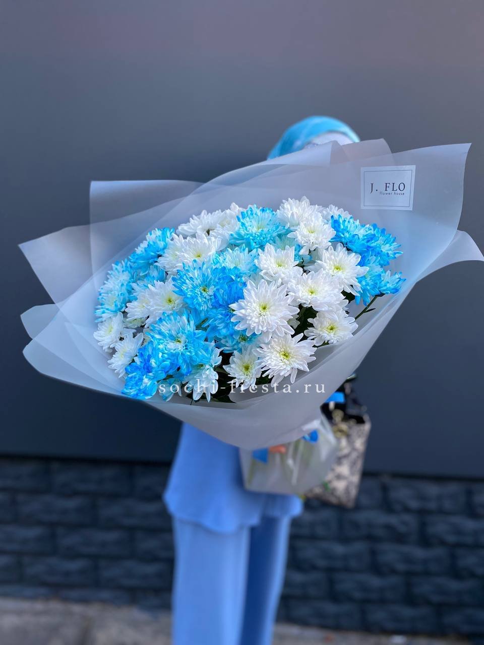 хризантема одноголовая - 9 шт., хамелациум, 5-7 шт., лента, дизайнерская упаковка.