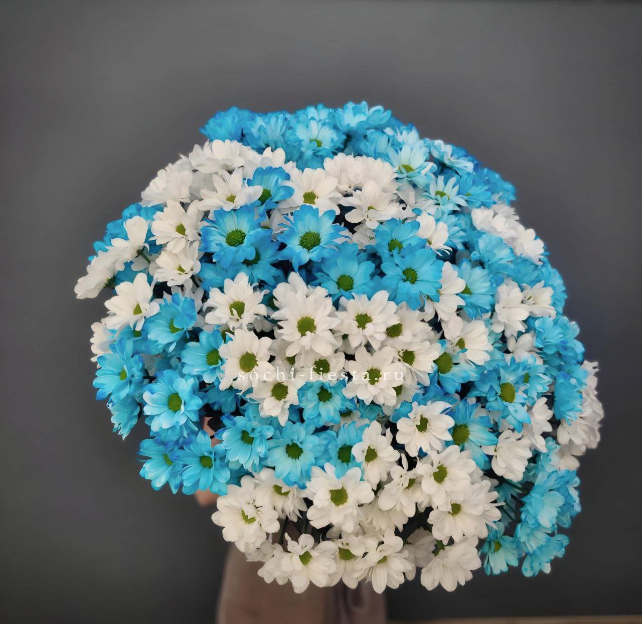 Пятьдесят одна ветка кустовых хризантем в миксе оттенков — это впечатляющий объем и буйство красок. Первый взгляд захватывает масштабом и многослойностью цветовой палитры.