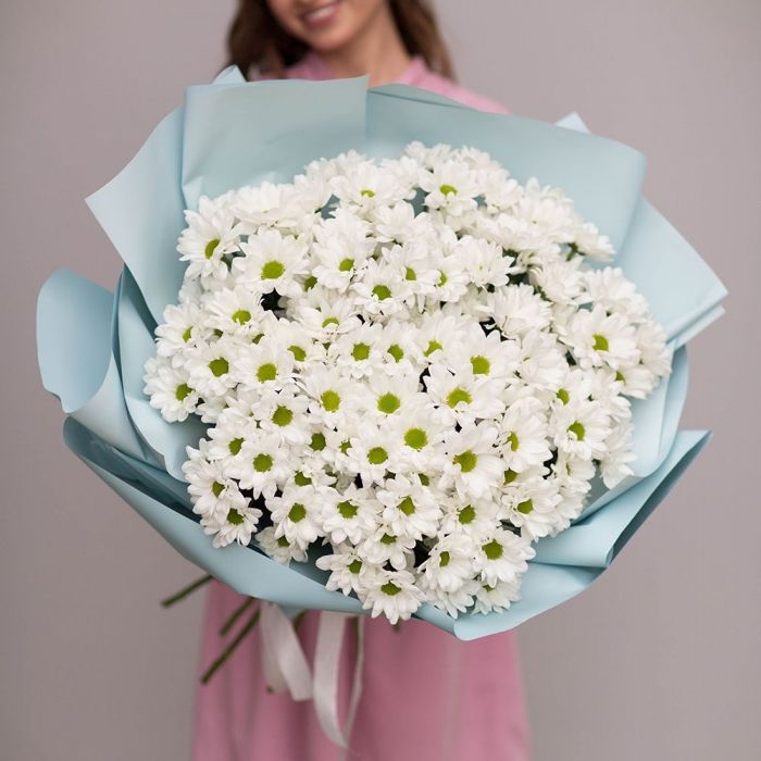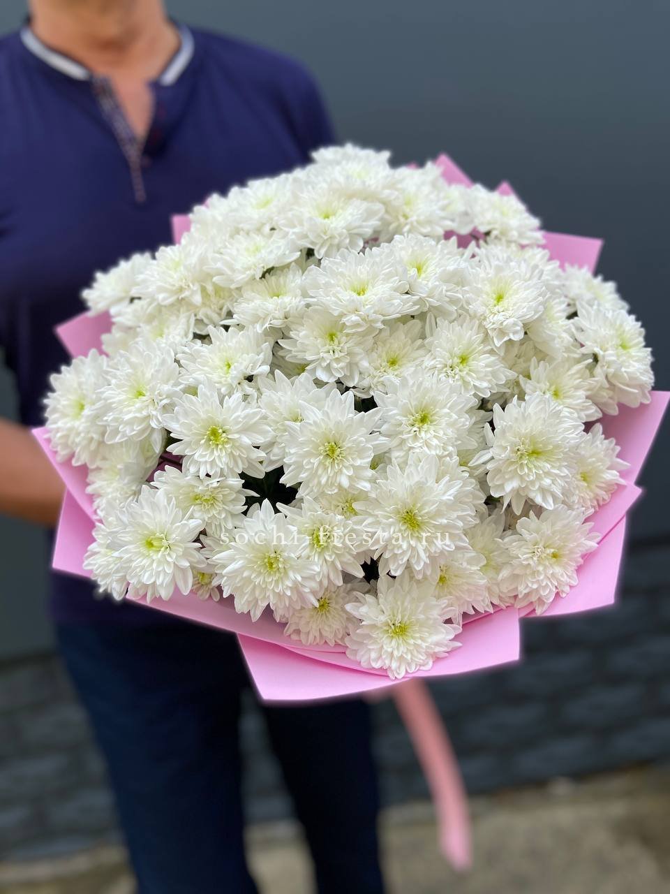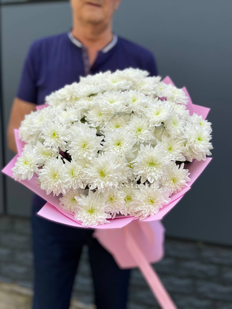 хризантемы Бигуди - 5, стифа (аналог по сезону),  лента, дизайнерская упаковка.