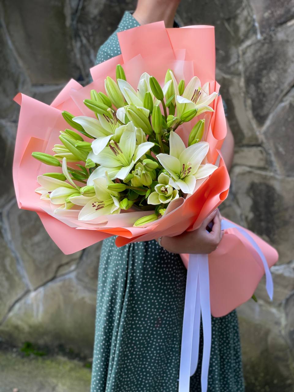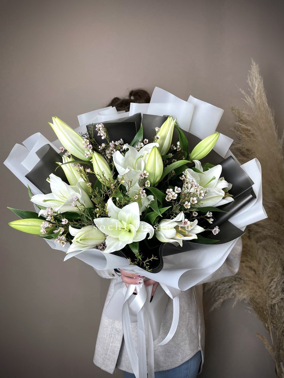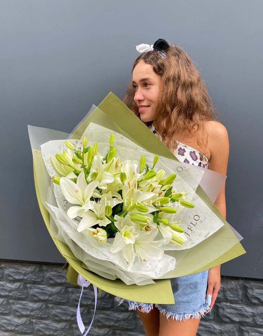 Пионовидные лилии раскрываются многослойными бутонами с густыми лепестками. Семь соцветий образуют пышную форму с выраженной фактурой и глубиной. Композиция впечатляет визуальной насыщенностью и природной красотой.