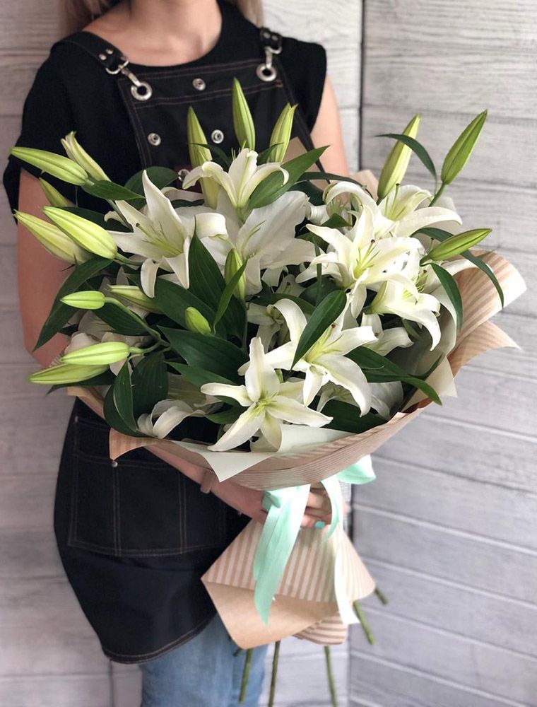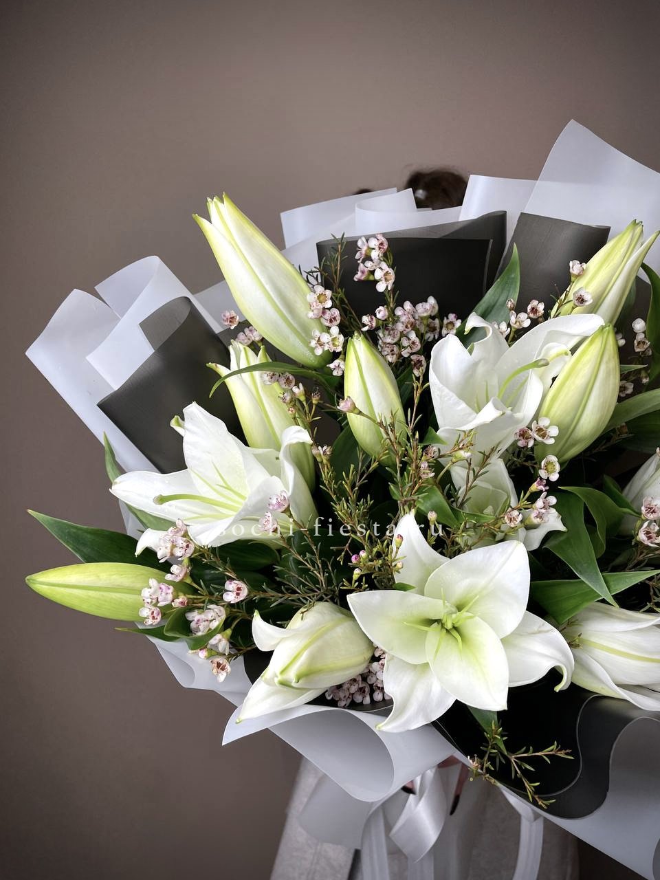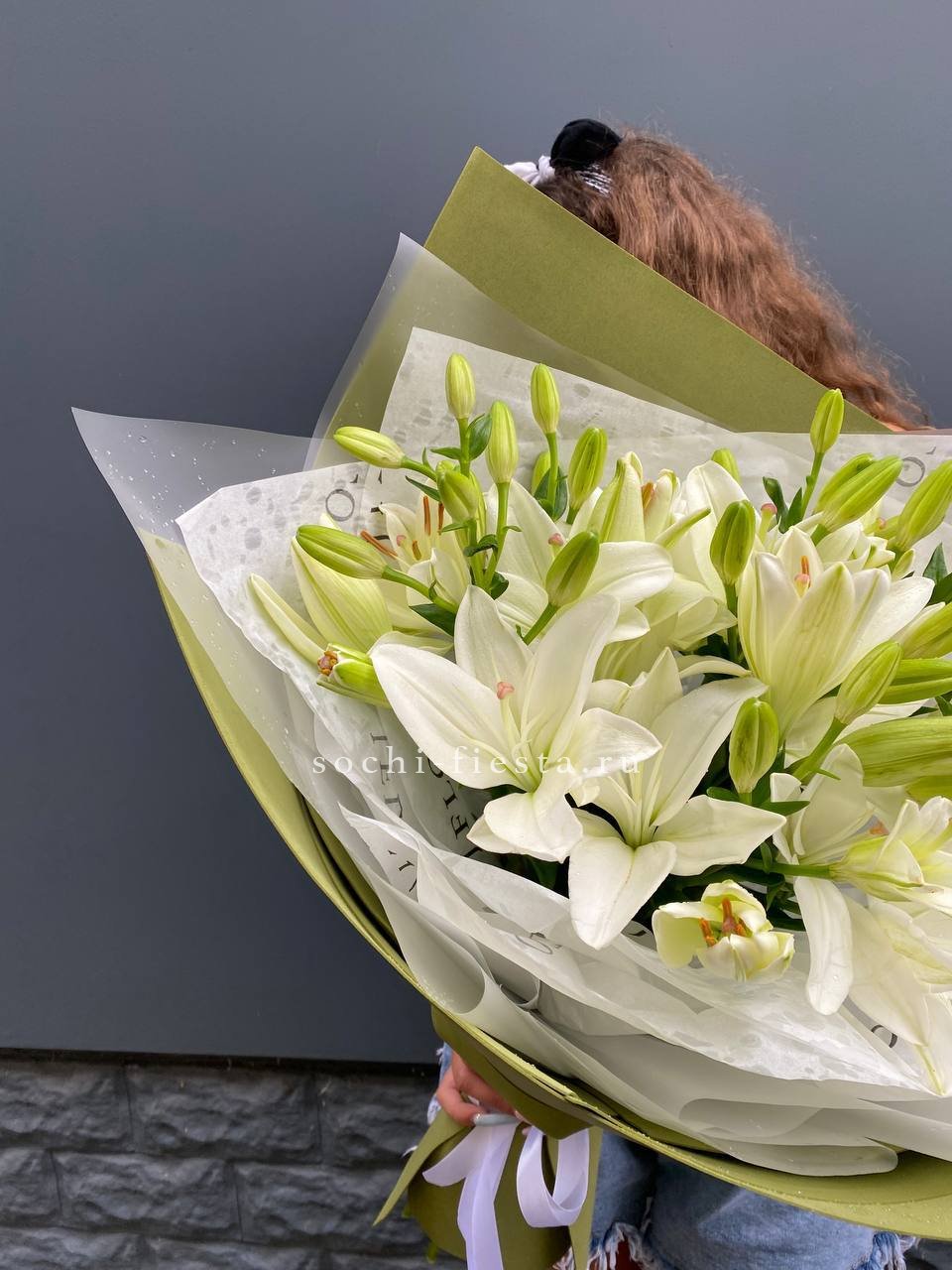 Пионовидные лилии раскрываются многослойными бутонами с густыми лепестками. Семь соцветий образуют пышную форму с выраженной фактурой и глубиной. Композиция впечатляет визуальной насыщенностью и природной красотой.