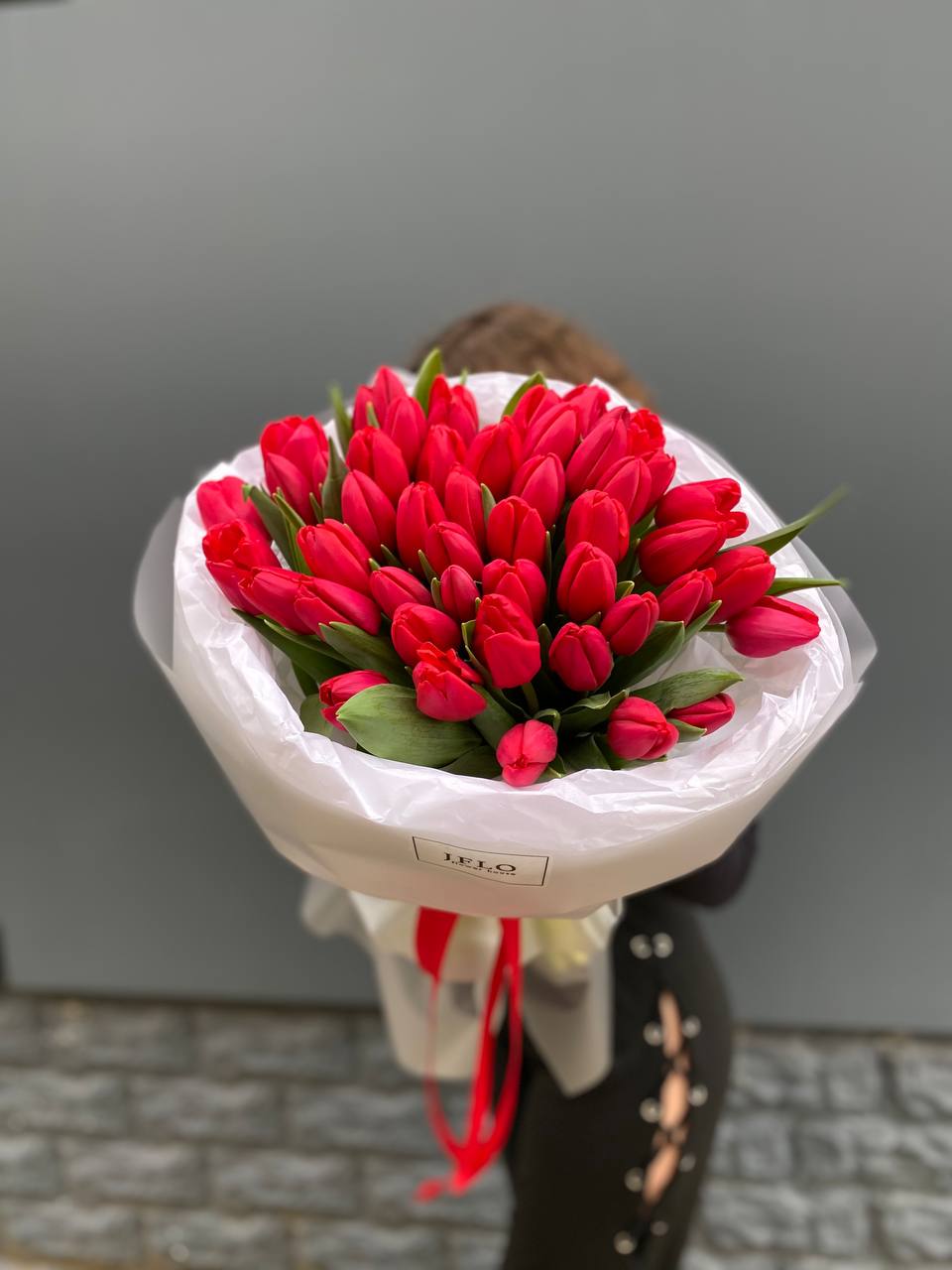 101 красный тюльпан, лента, дизайнерская пленка.