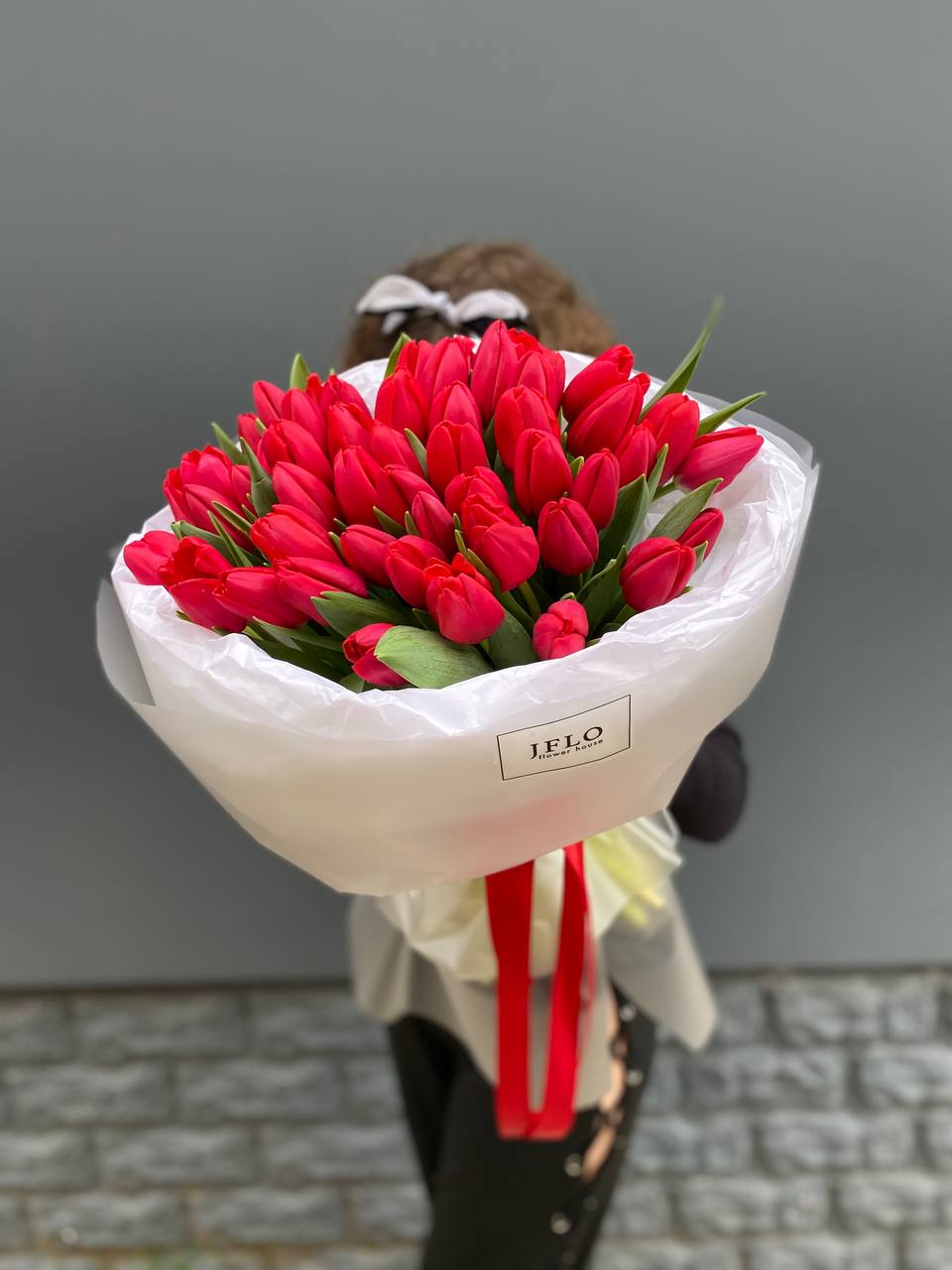 Сто один тюльпан ярко-красного цвета собраны в плотную вертикальную композицию. Весенняя свежесть и насыщенный оттенок лепестков создают мощное цветовое пятно, которое оживляет любое пространство.