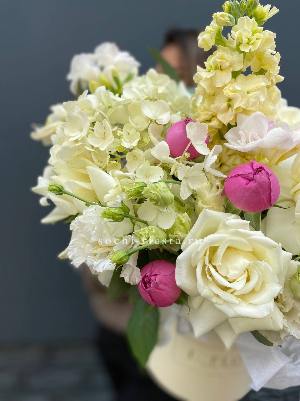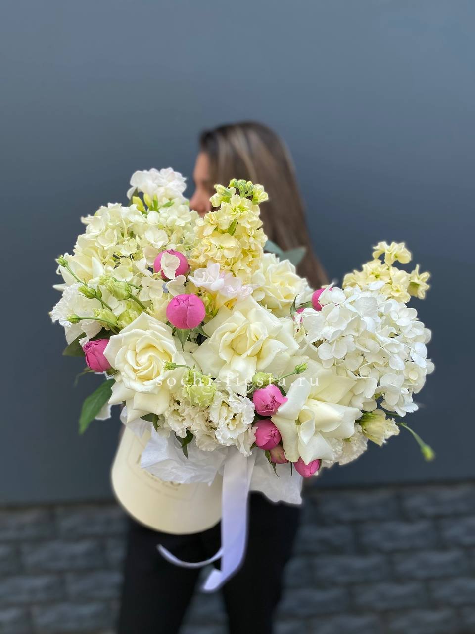 гортензии, роза одноголовая, роза кустовая, гербера, озотамнус, диантус, эвкалипт, декоративные перья, лента, дизайнерская упаковка.