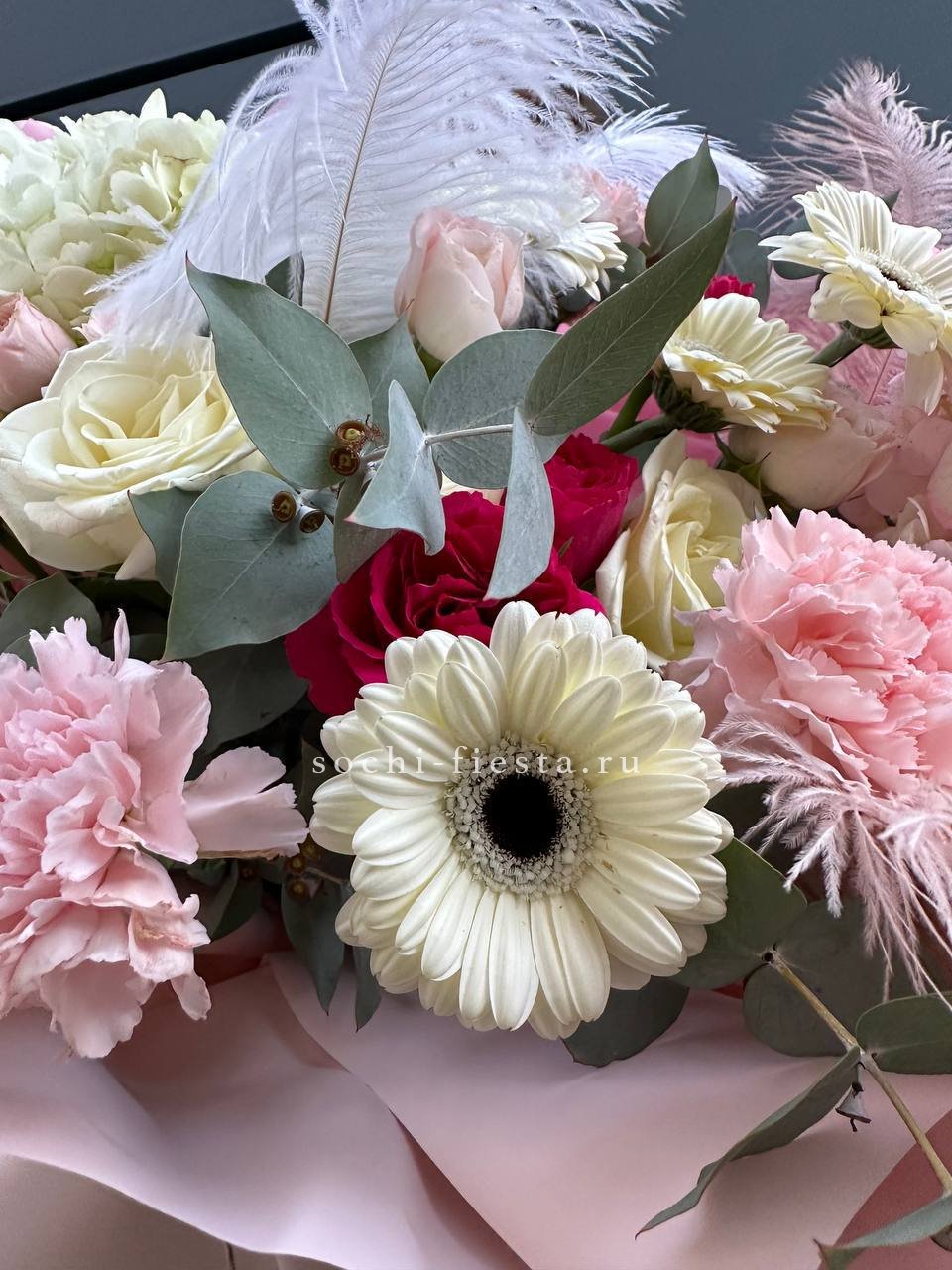 Пышный микс соцветий гортензии, роз и гербер с добавлением перьев и озотамнуса. Авторская композиция объединяет садовую свободу и графичную точность линий.