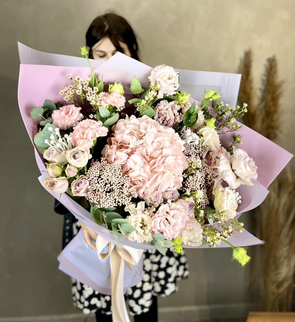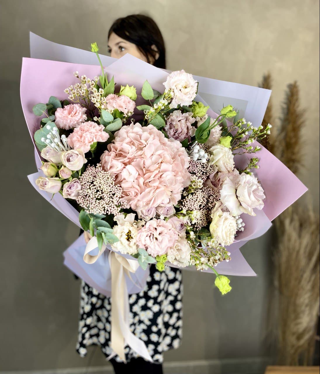 гортензии, роза одноголовая, роза кустовая, гербера, озотамнус, диантус, эвкалипт, декоративные перья, лента, дизайнерская упаковка.