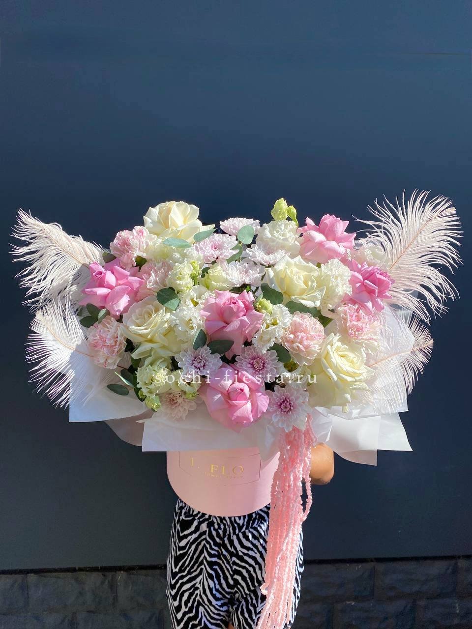 Перья и амарантус добавляют композиции воздушности и движения между французскими розами и хризантемами. Эустома и диантусы смягчают силуэт и создают многослойную фактуру в высоком боксе.