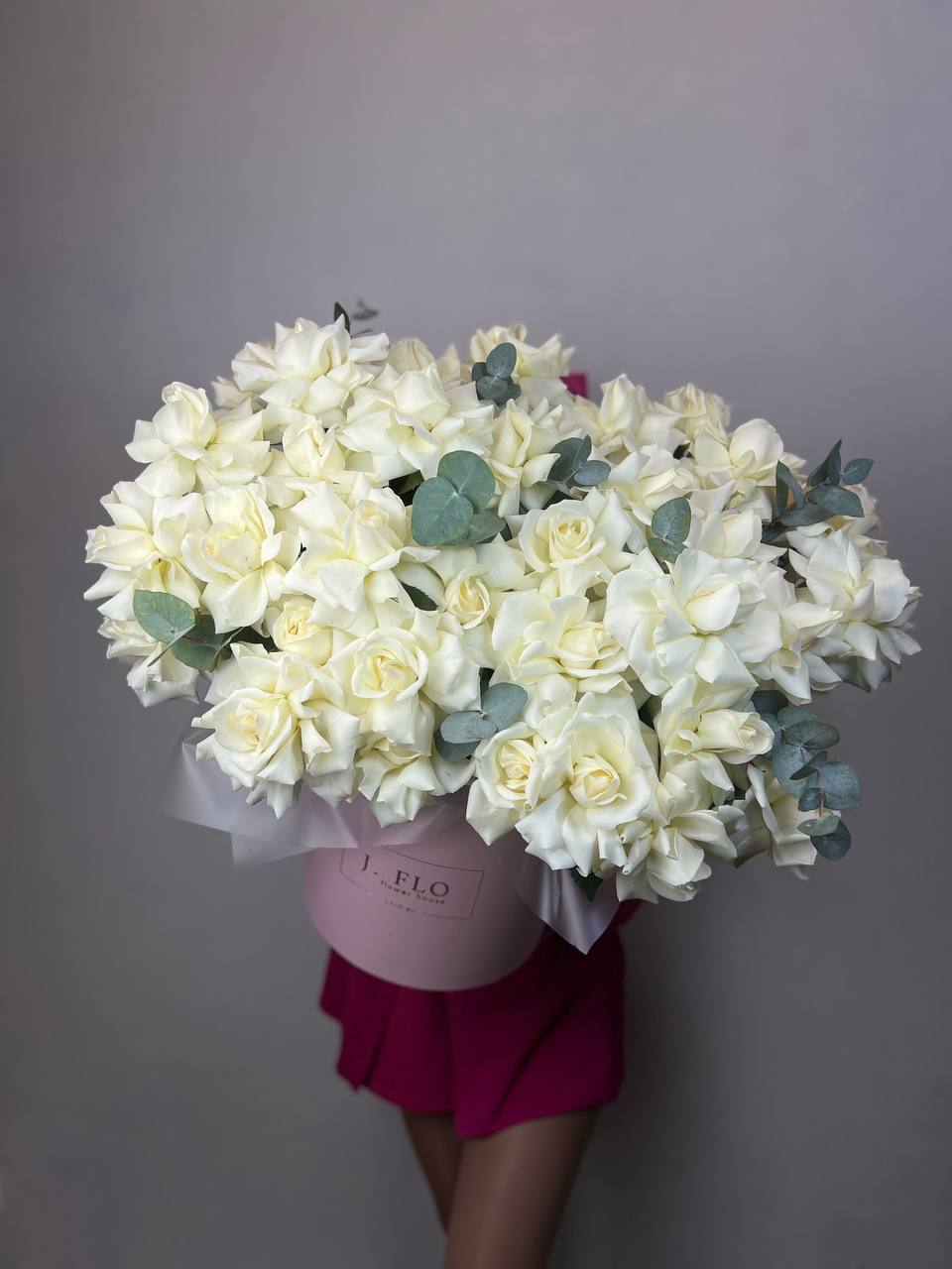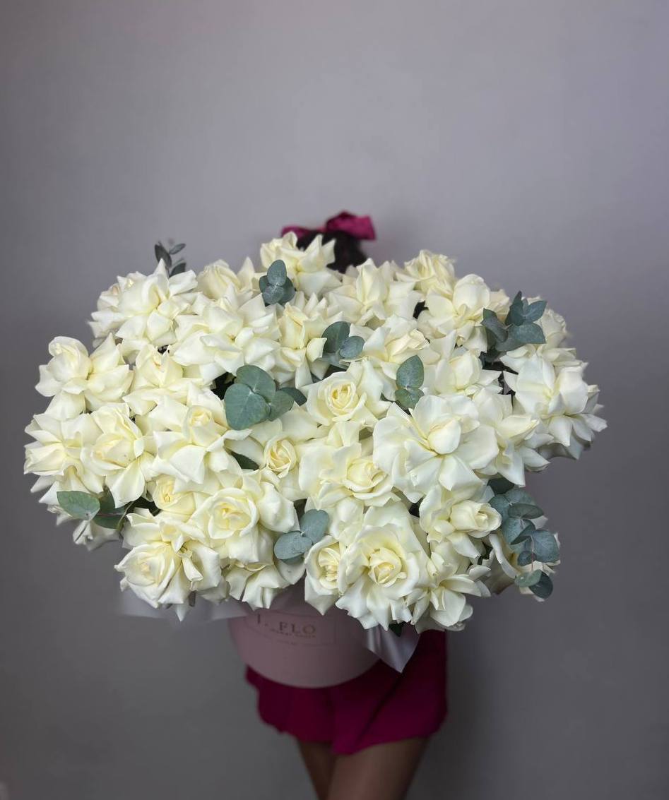 Кремовая палитра с переходами от молочного до сливочного оттенка объединяет розы, эустому и пушистую гортензию. Букет выглядит цельно и мягко, словно утренний свет на лепестках.
