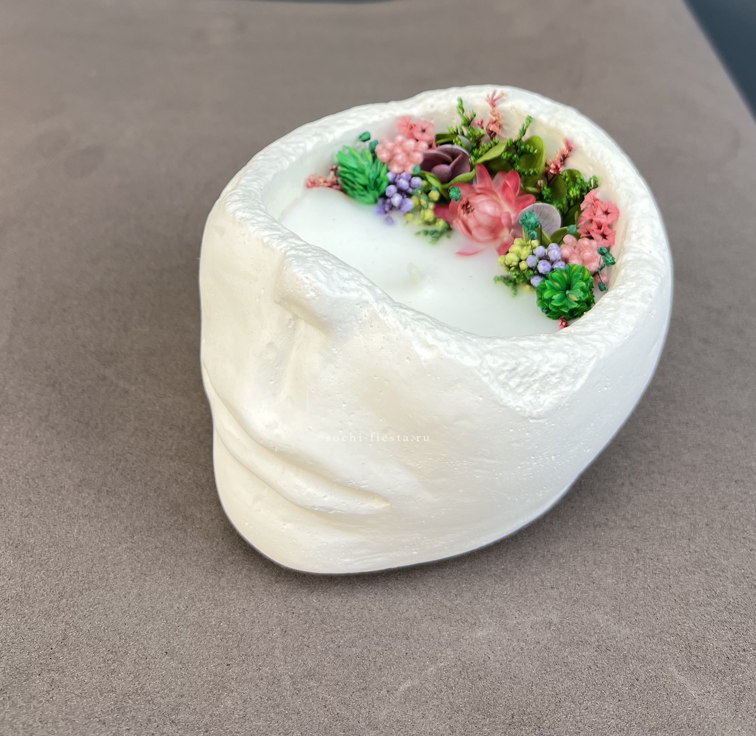 Ручная работа из кокосового воска с ароматом бузины в матовом гипсовом корпусе. Скульптурная форма лица добавляет интерьеру графичности и современного звучания.