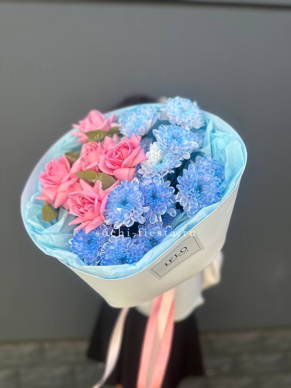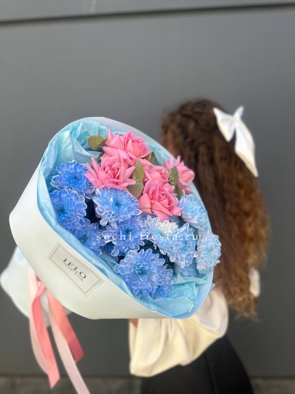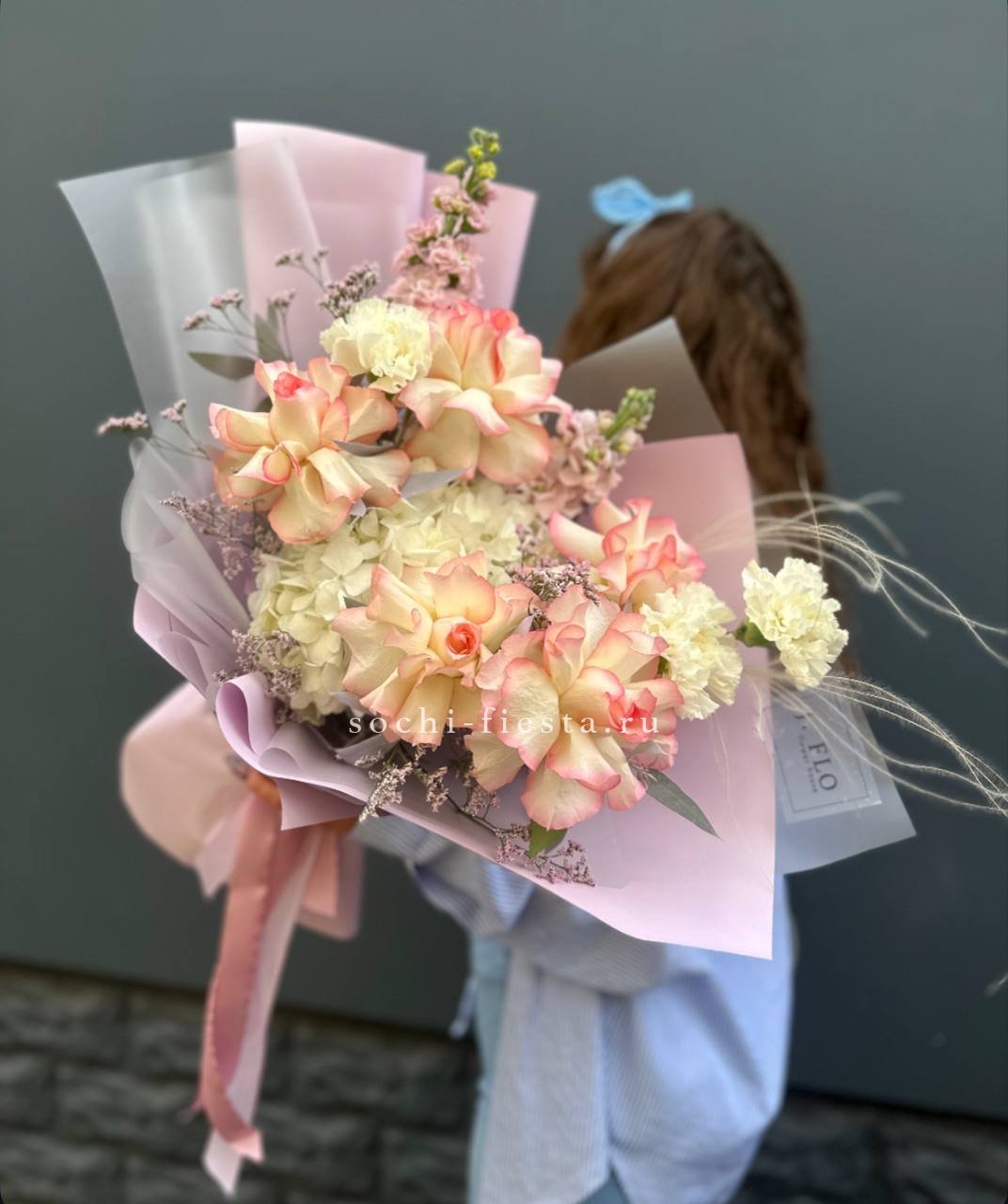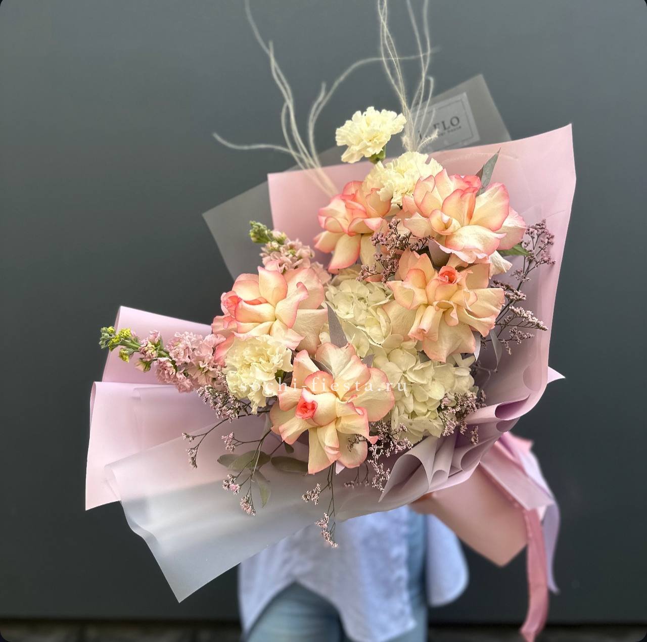 Пионовидные розы соседствуют с классическими, создавая игру объёмов и плотности бутонов. Диантус вплетается между ними легкими штрихами. Эвкалипт добавляет воздуха и завершает силуэт.