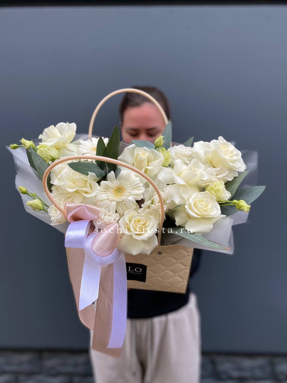 герберы, эустома, белая роза, эвкалипт, лента, сумка-кашпо.