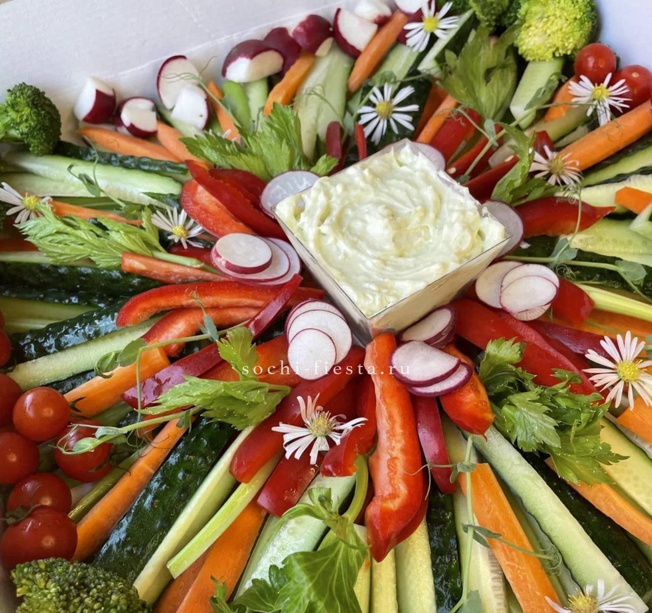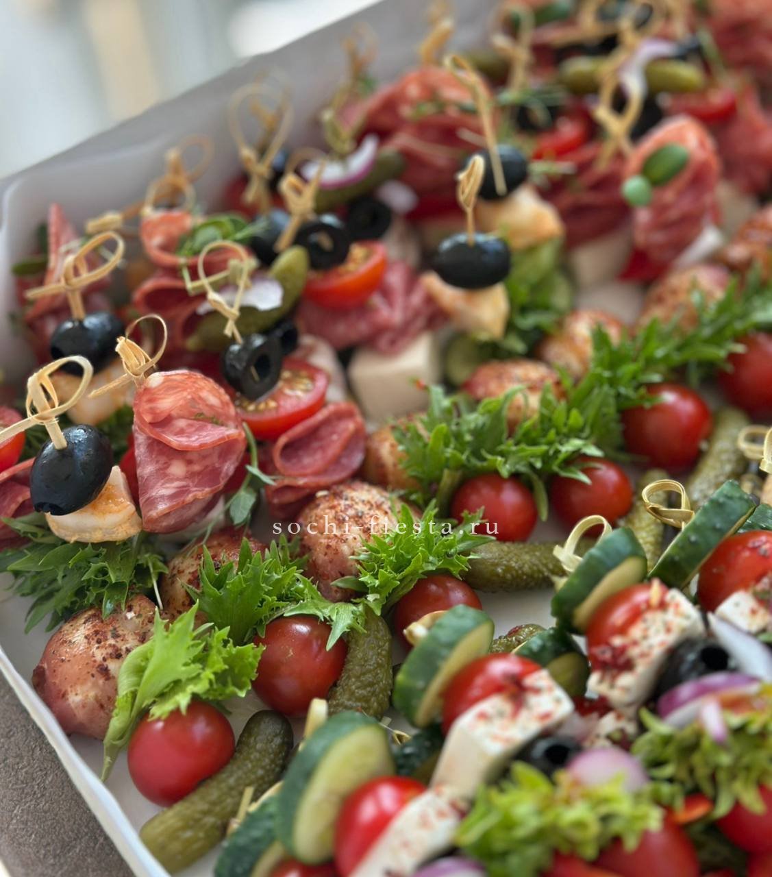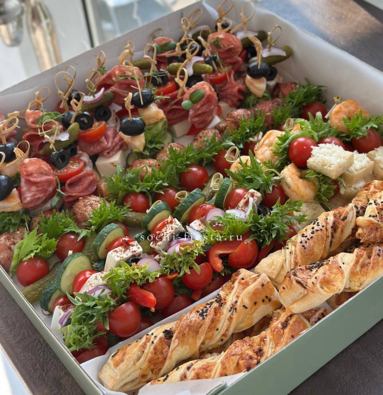 конвертики с овощами и ветчиной- 5 шт. Мини тосты с лососем, редисом и лимоном- 5 шт. Тарталетки с рийетом из лосося- 5 шт. Яйцо в пикантной начинкой из сыра- 5 шт.