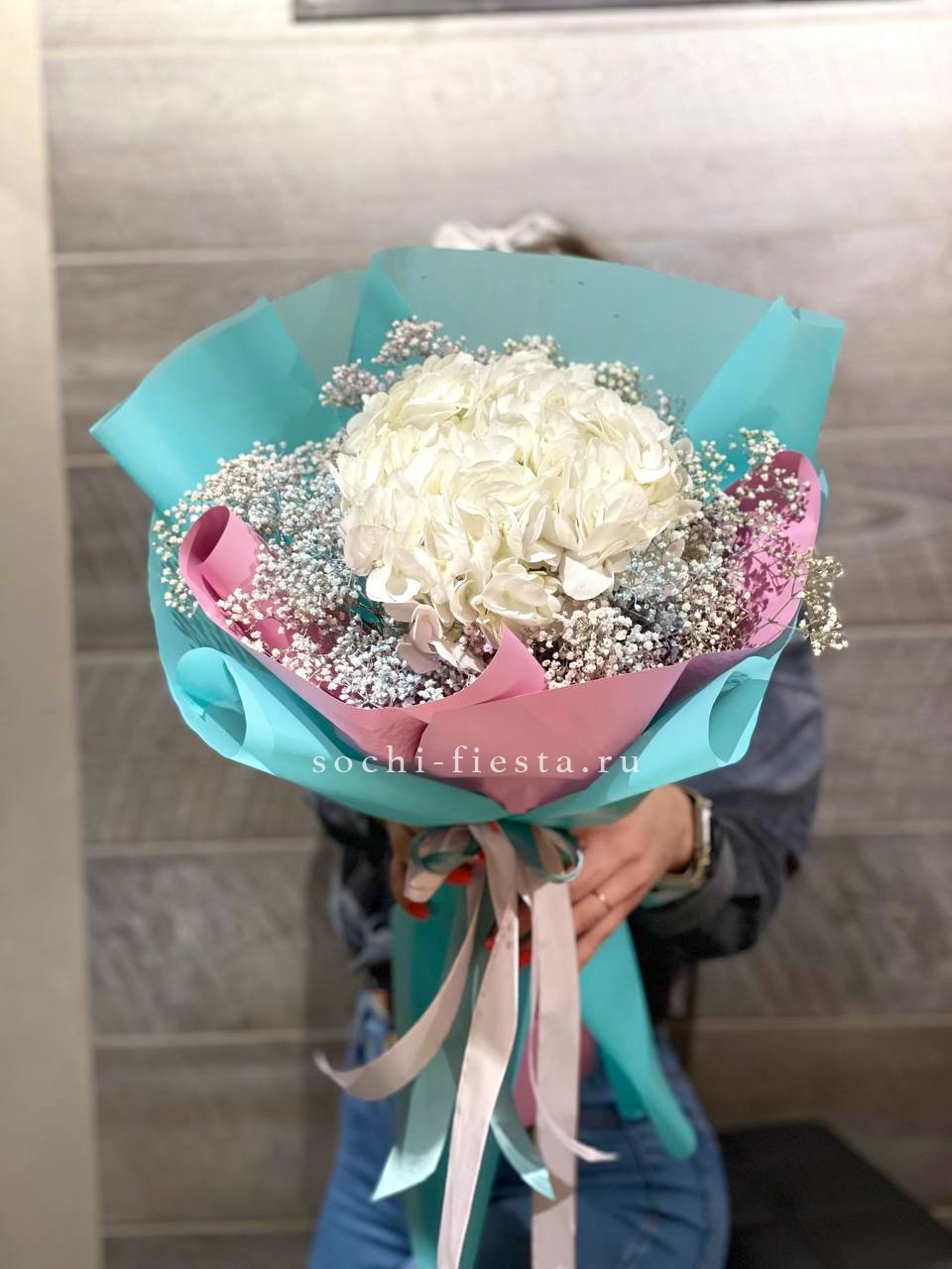 гортензия, гипсофила, лента, дизайнерская упаковка.