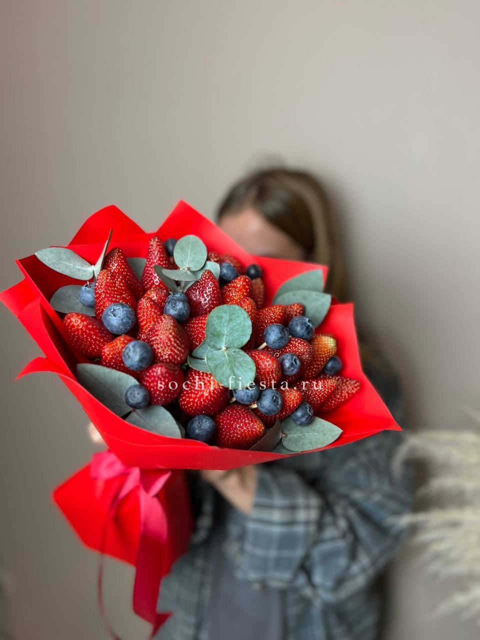 500-600г. ароматной клубники, голубика, мята или эвкалипт, лента, крафт.