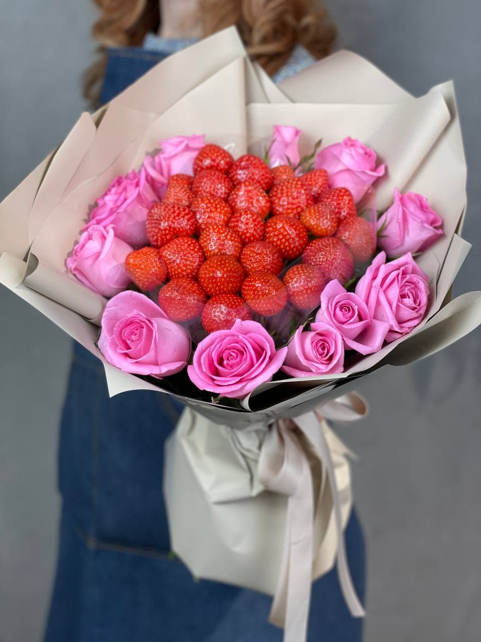 Одиннадцать розовых роз и спелая клубника собраны в букет с чёткой геометрией. Дизайнерская бумага удерживает форму, ягоды распределены равномерно между цветами.