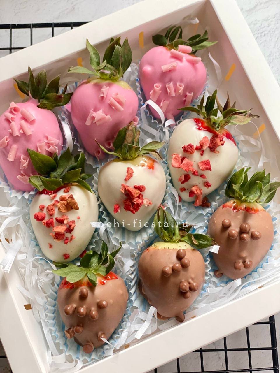 300-400г. ароматной клубники, 11 розовых роз, лента, дизайнерская бумага.