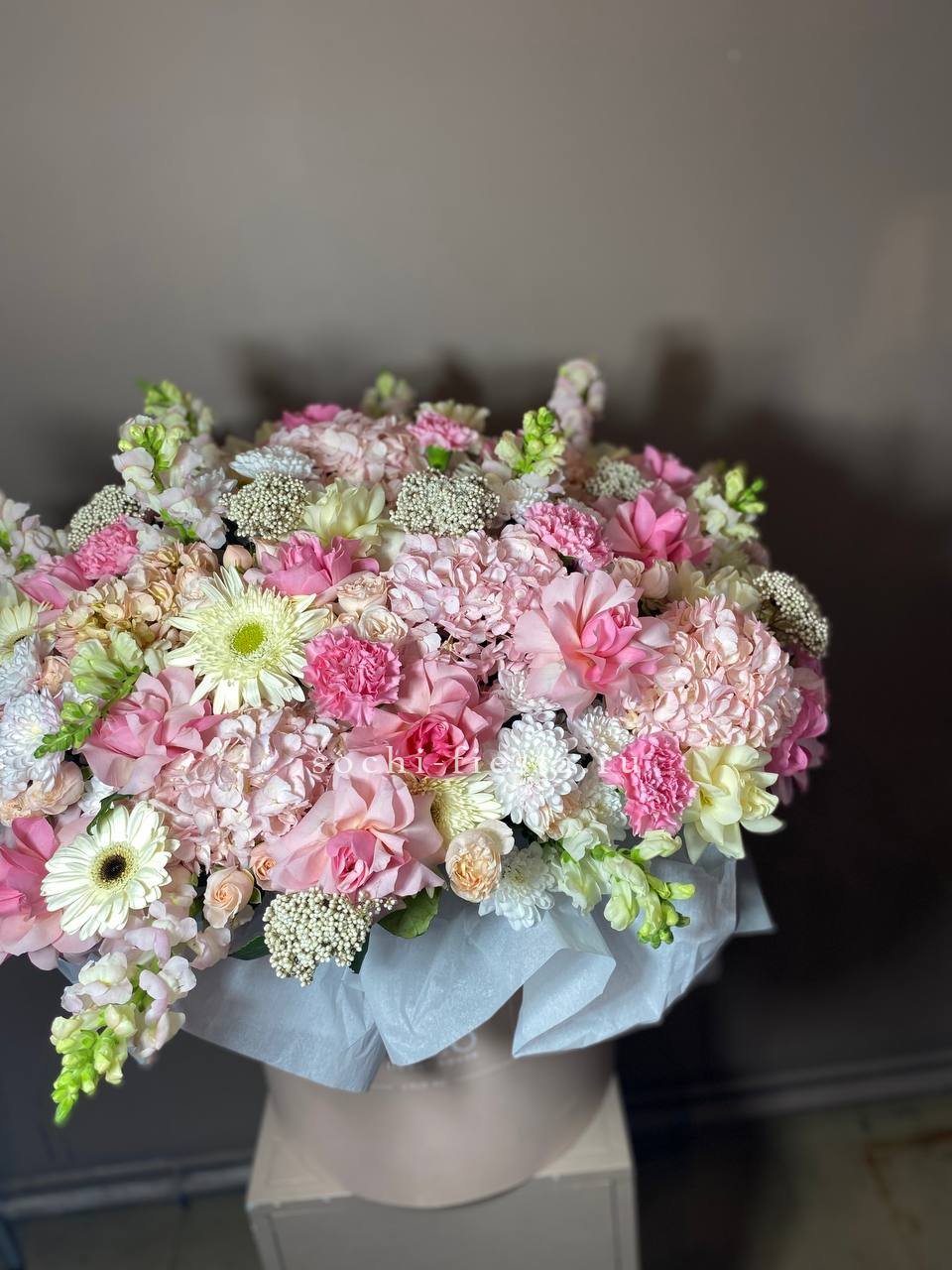 хризантемы, герберы, розы, антиринум, диантус, гортензия, бомбастик, озатамус в коробке или корзине на выбор.