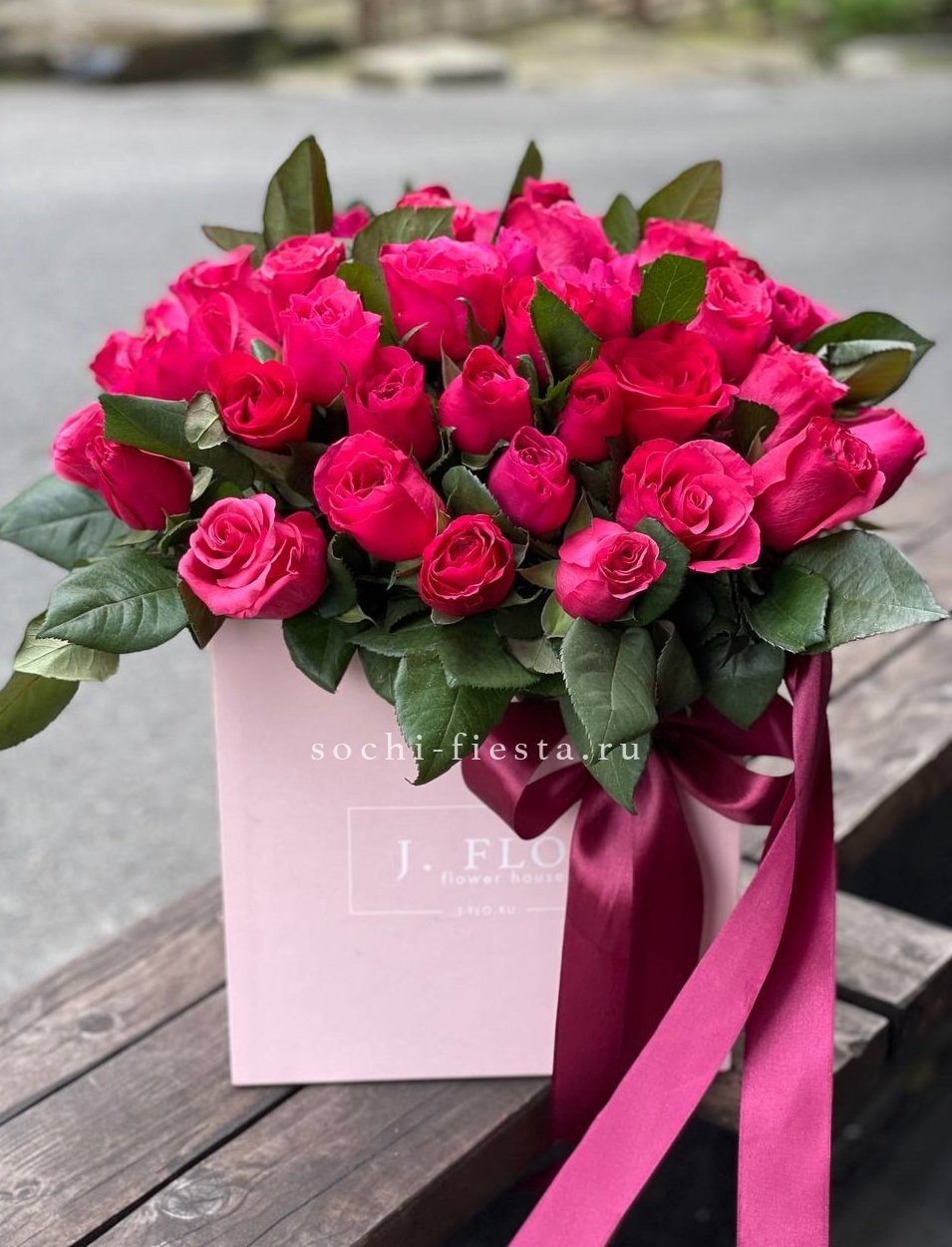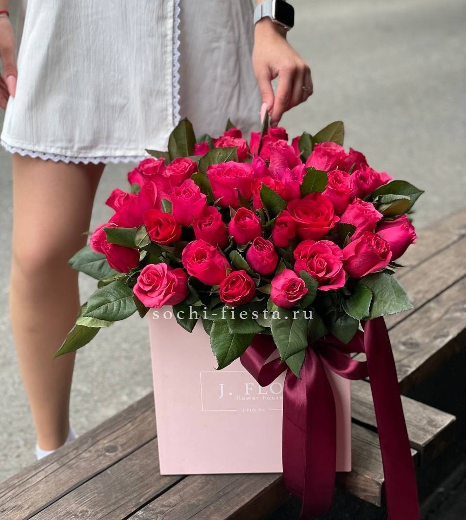 Пятьдесят пять бутонов глубокого красного оттенка собраны в плотную графичную форму. Квадратная коробка задает четкий ритм и усиливает насыщенность цвета.