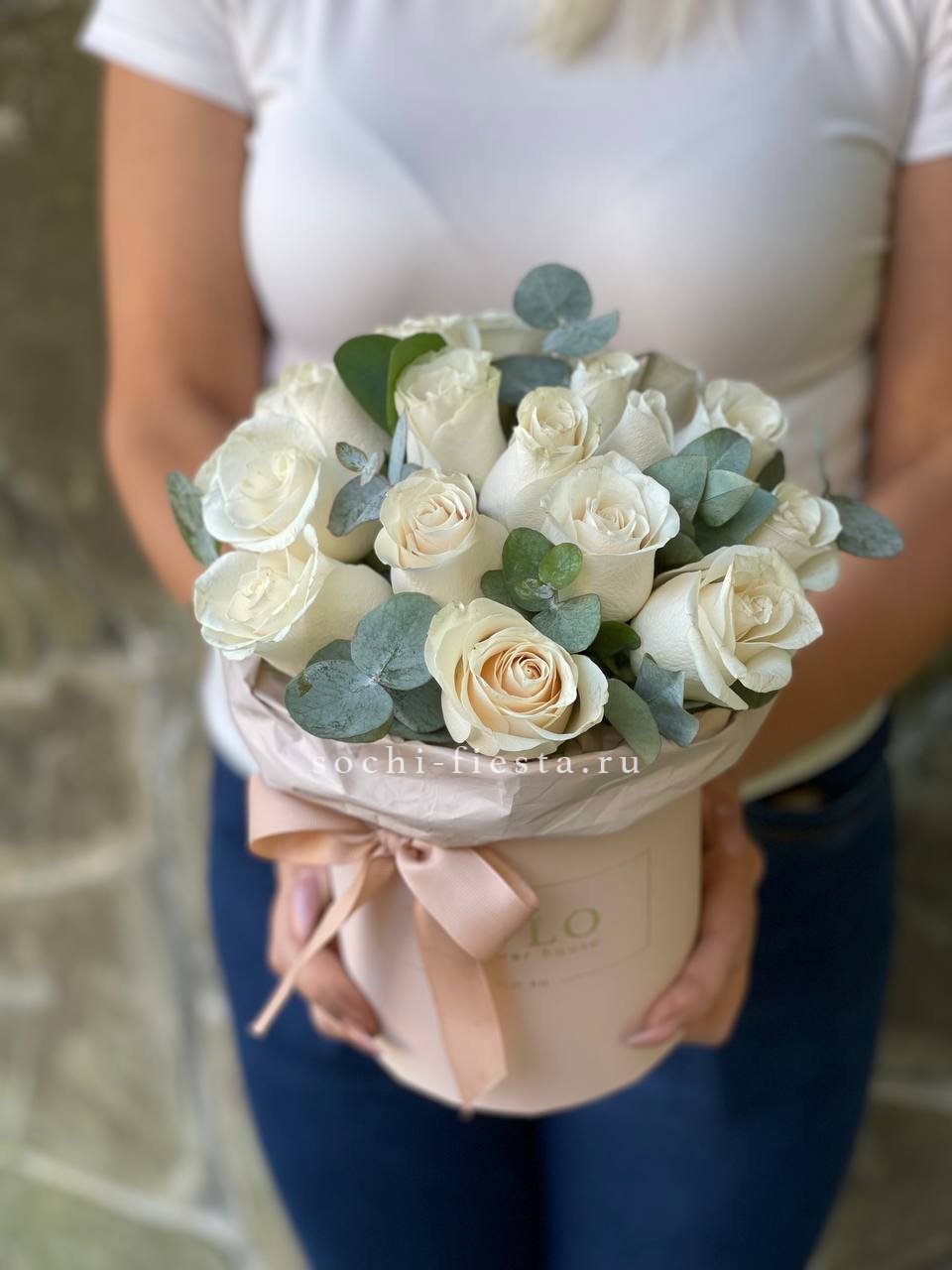 цветочная композиция, выполненная в бежевом цилиндре диаметром 20 см.