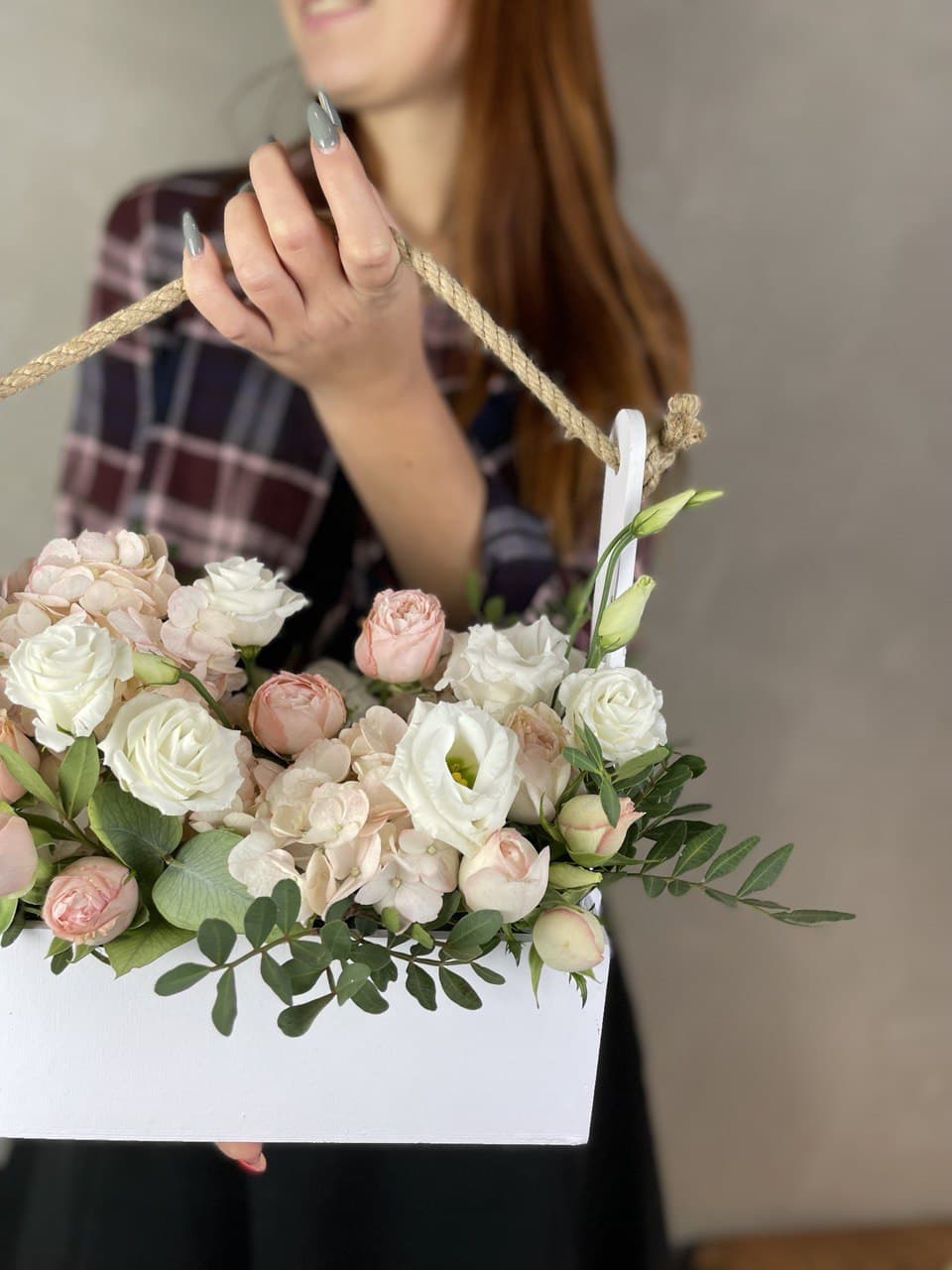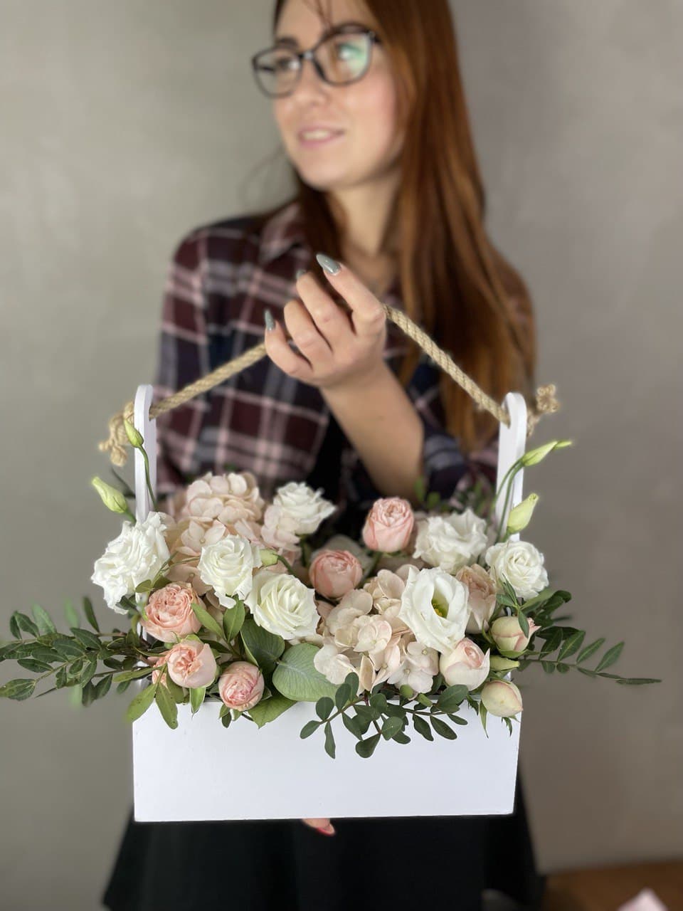 Кремовая палитра с переходами в цвете создаёт мягкое свечение композиции. Гортензия и эустома образуют воздушную текстуру, а кустовые розы добавляют объём. Деревянный ящик завершает природную эстетику.
