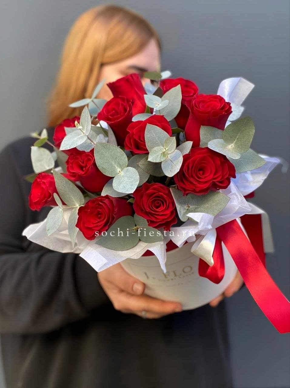 Одиннадцать красных роз выстроены в цилиндре ровным силуэтом. Эвкалипт окружает бутоны по краю и подчеркивает графичность композиции.