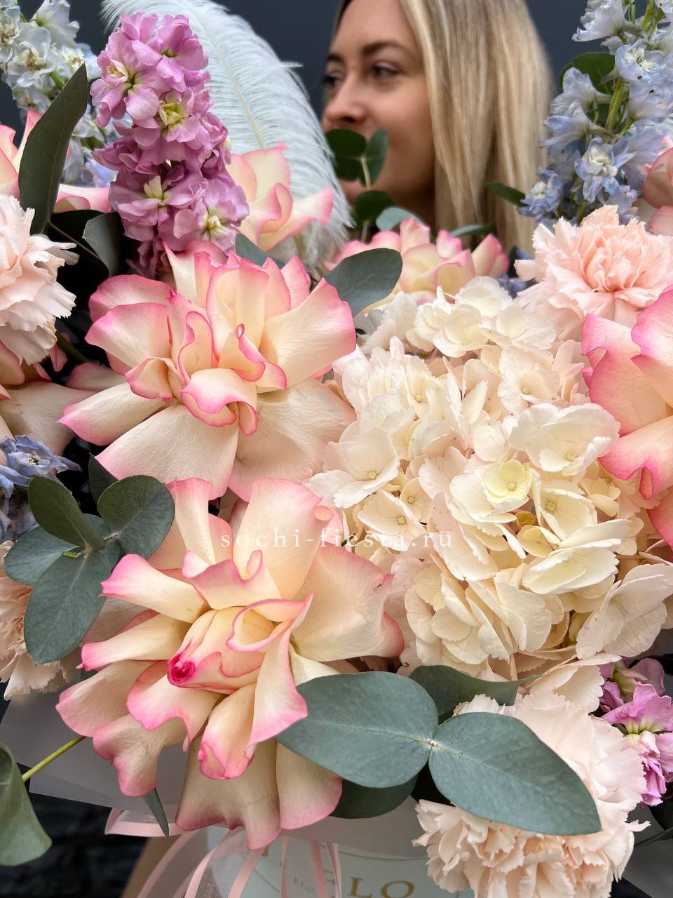 вывернутые  розы Джумилия, дельфиниум , гортензия, диантус, маттиола, цилиндр D20, эвкалипт, лента, упаковка.