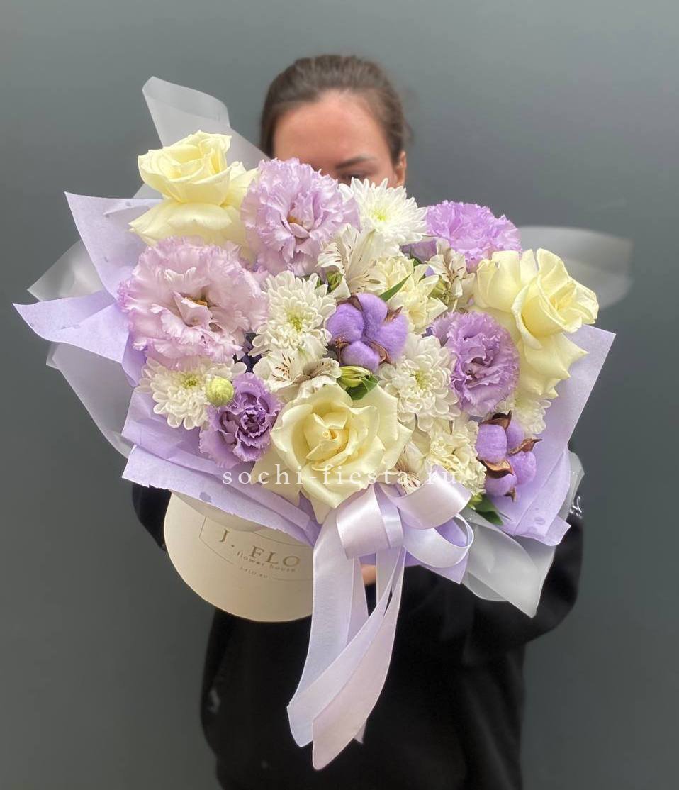 Композиция собрана из альстромерий, эустомы и хризантем с добавлением воздушного хлопка. Мягкие оттенки и разная фактура бутонов создают живописный объем. Дизайнерская упаковка завершает образ.
