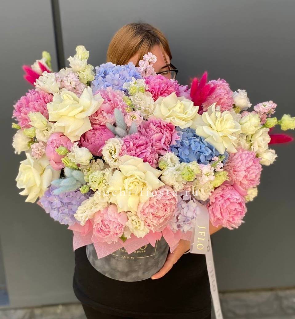 Пионы и гортензия занимают центральную часть, окружённые белыми розами и соцветиями эустомы. Маттиола вносит воздушность в плотно собранную форму.