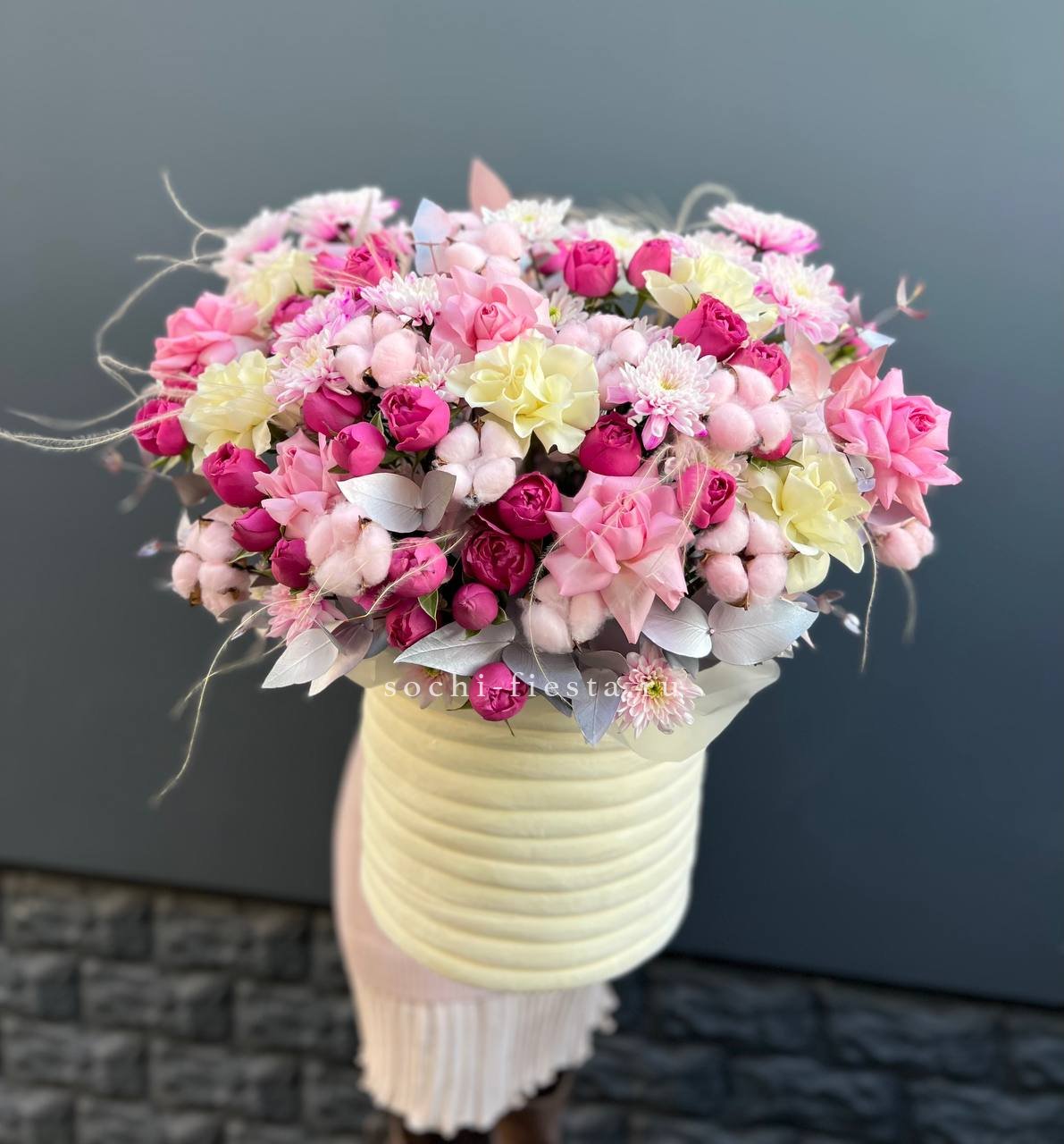 Французские розы соседствуют с пушистой маттиолой и яркими диантусами в компактном цилиндре. Разная высота бутонов создает живой ритм и легкую динамику.