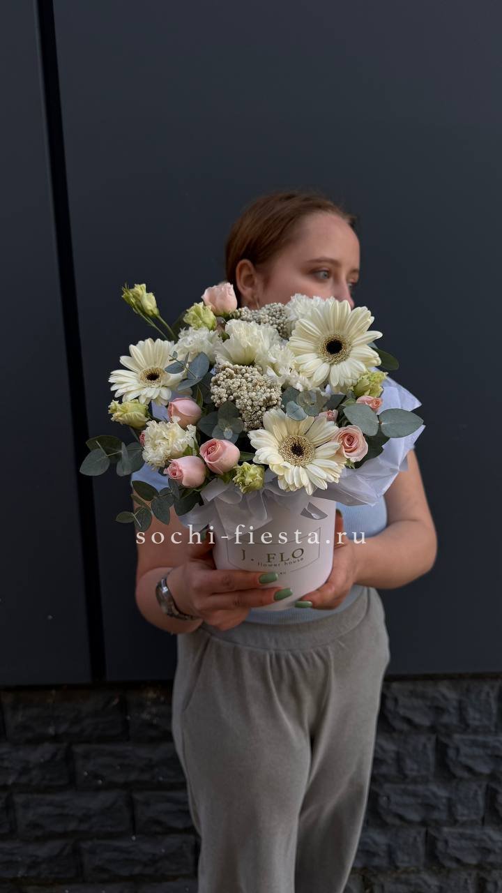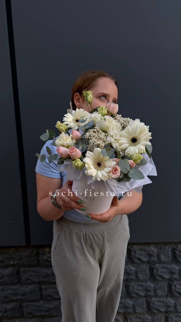 Воздушная композиция в бархатной коробке раскрывается пышными соцветиями гортензии и многолепестковыми бутонами эустомы. Розы двух оттенков создают мягкий переход от белоснежного к пудровому. Флористическая пена сохраняет свежесть каждого цветка надолго.