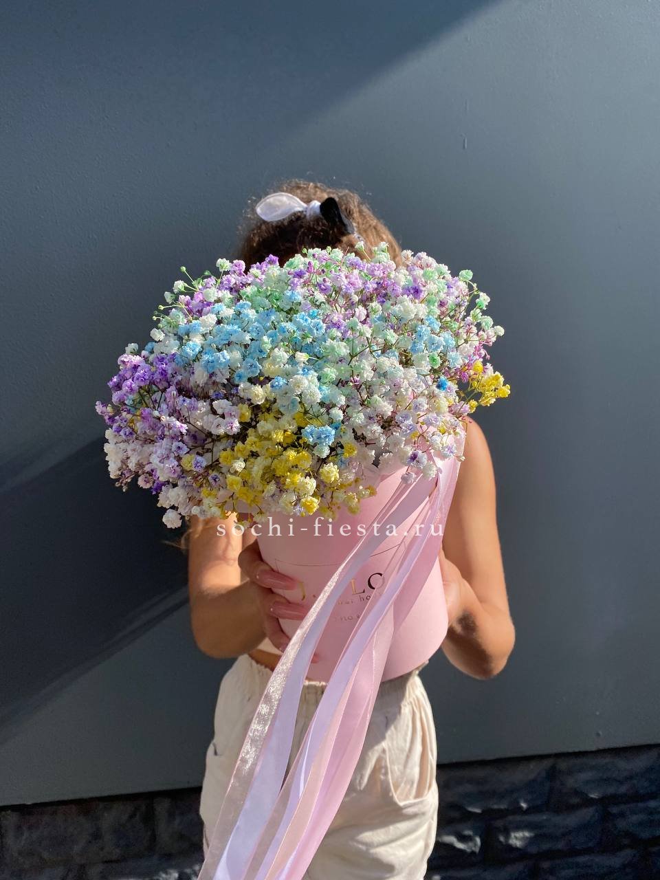Воздушные соцветия гипсофилы переливаются радужными оттенками в компактном цилиндре. Лёгкая текстура наполняет пространство. Композиция выглядит свежо и современно.
