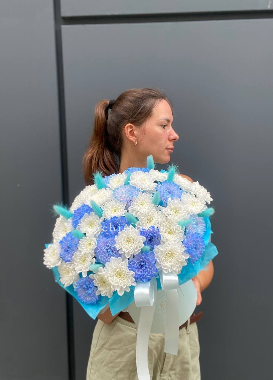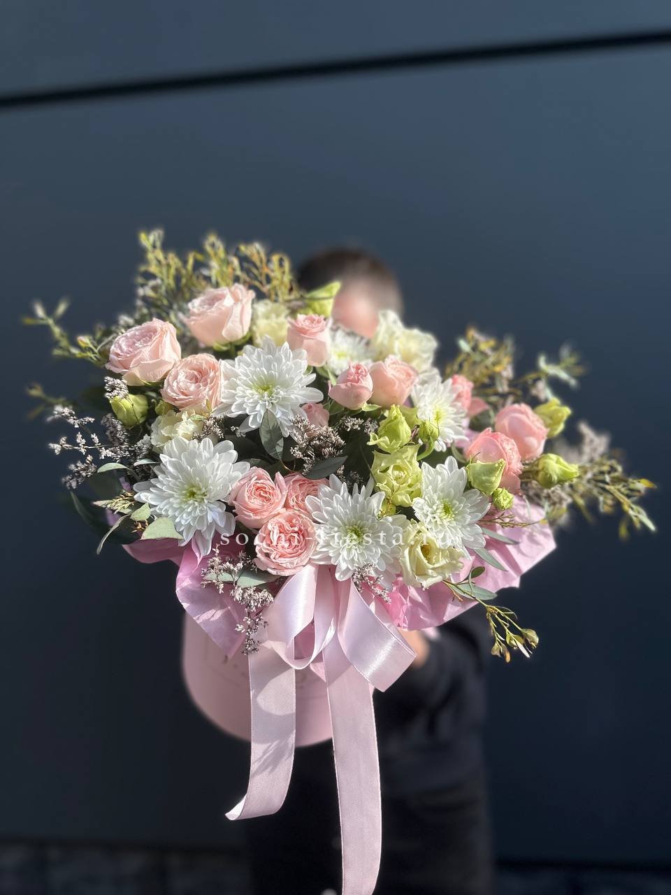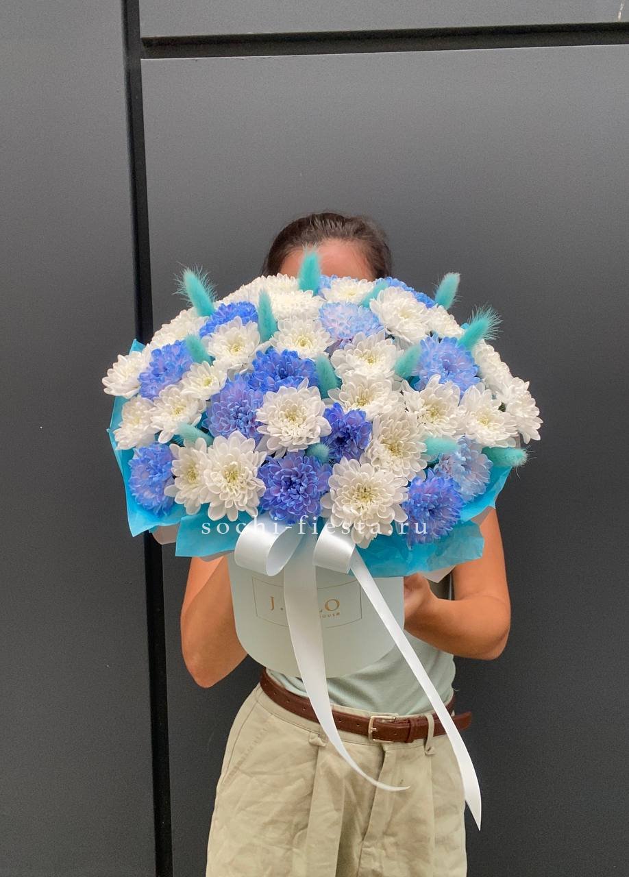 Хризантемы и кустовые розы раскрываются слоями, создавая воздушную текстуру. Эустома добавляет глубину, а эвкалипт формирует естественный контур. Композиция в боксе держит форму и долго сохраняет свежесть.