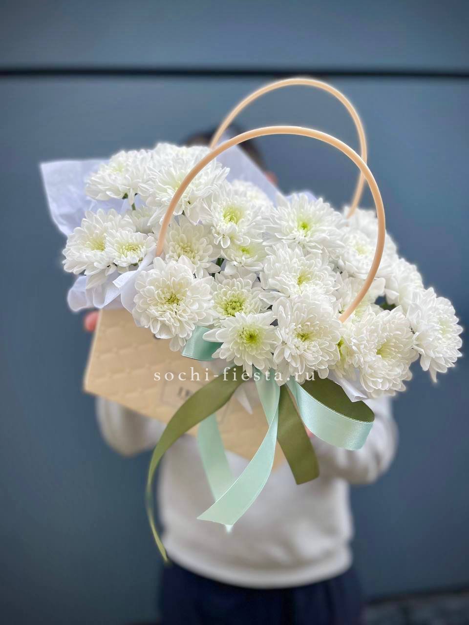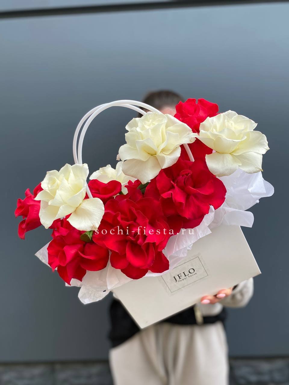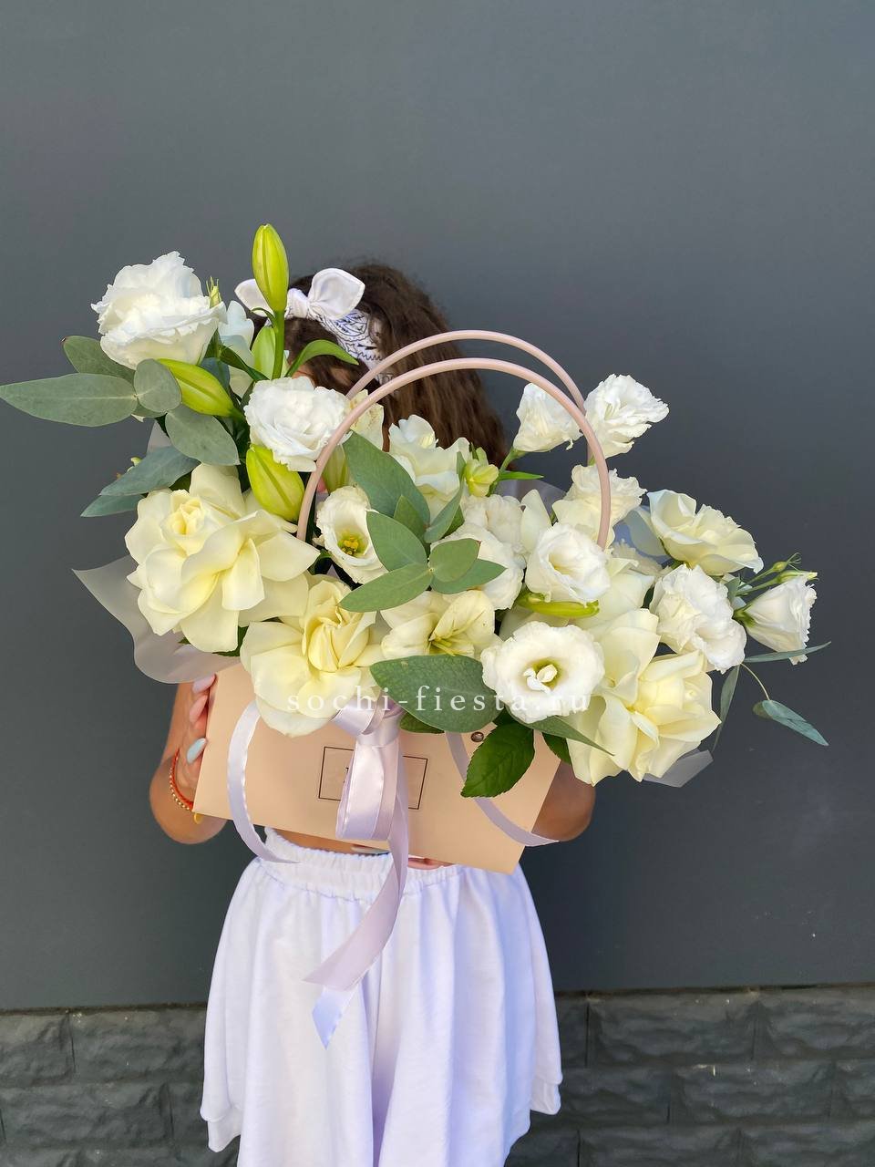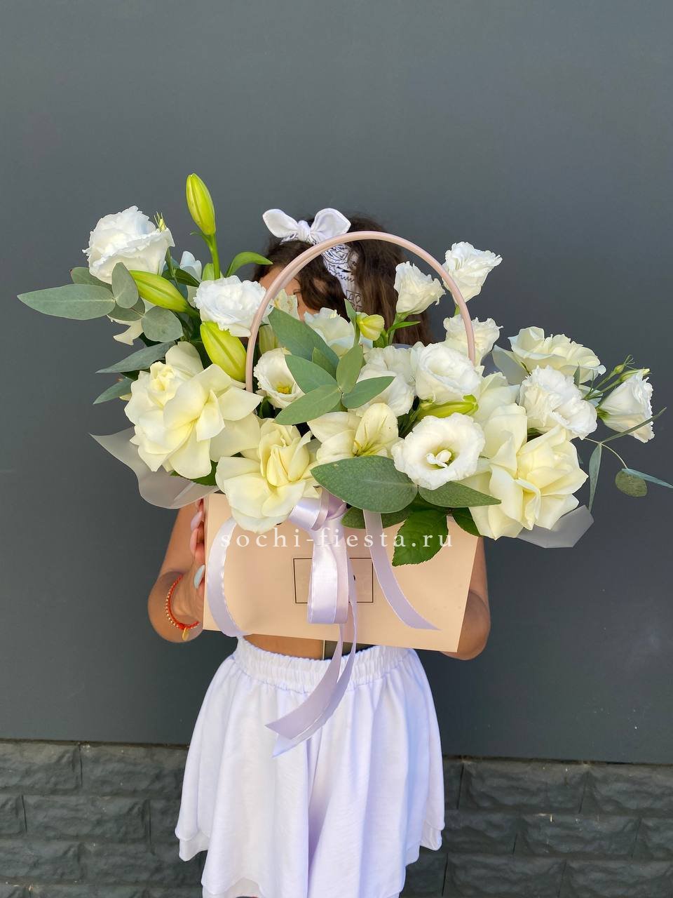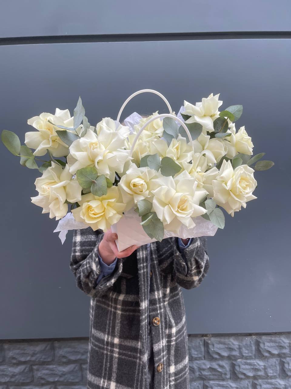 гортензия, розы, эустома, эвкалипт, диантус, лента, сумка.