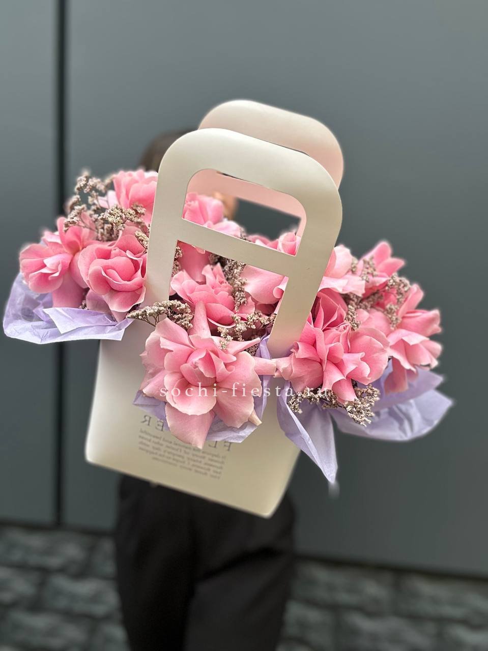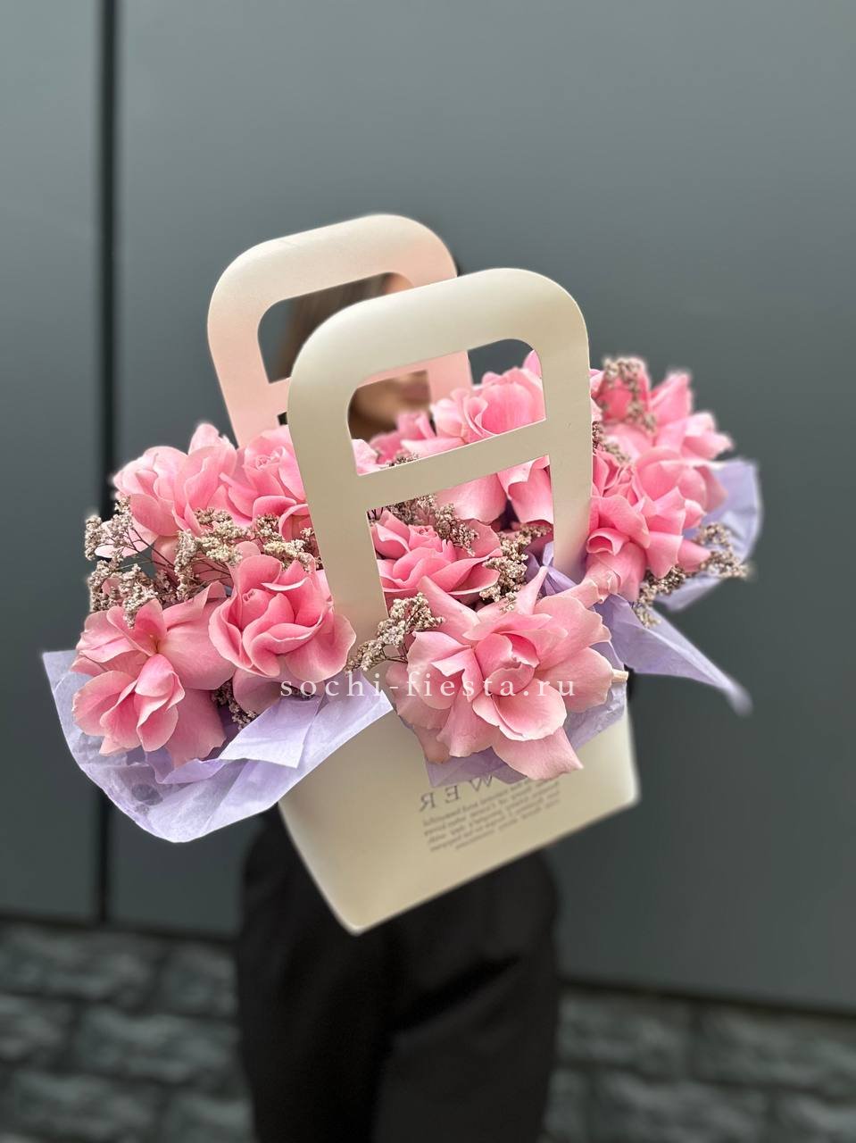Французские розы собраны в аккуратную форму и помещены в сумочку. Компактная композиция легко помещается на столе или полке, сохраняя свежесть и опрятный вид.