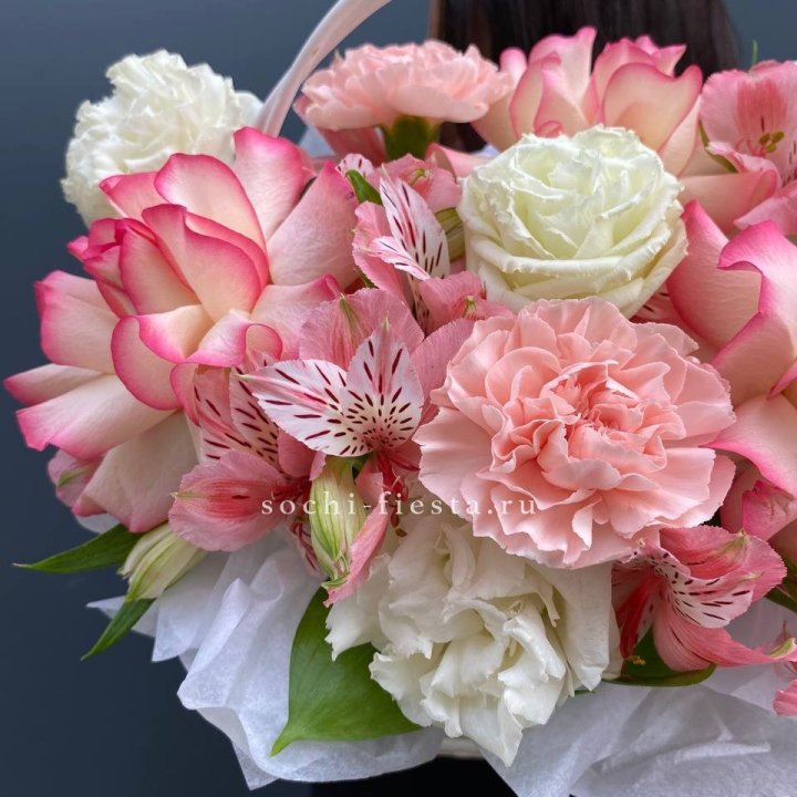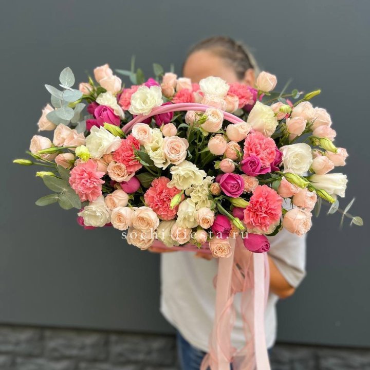Состав корзин в Тамбове определяется текущими поставками и сезоном. Розы Freedom, Mondial, Cappuccino — для классических куполообразных аранжировок. Пионы в мае-июне из свежих поставок: Sarah Bernhardt, Red Charm, Bowl of Cream — главный сезонный продукт. Хризантема, альстромерия, гербера — для объёмных торжественных наполнений. Эустома, ранункули — для садовых корзин. Флорист строит состав под конкретный запрос.