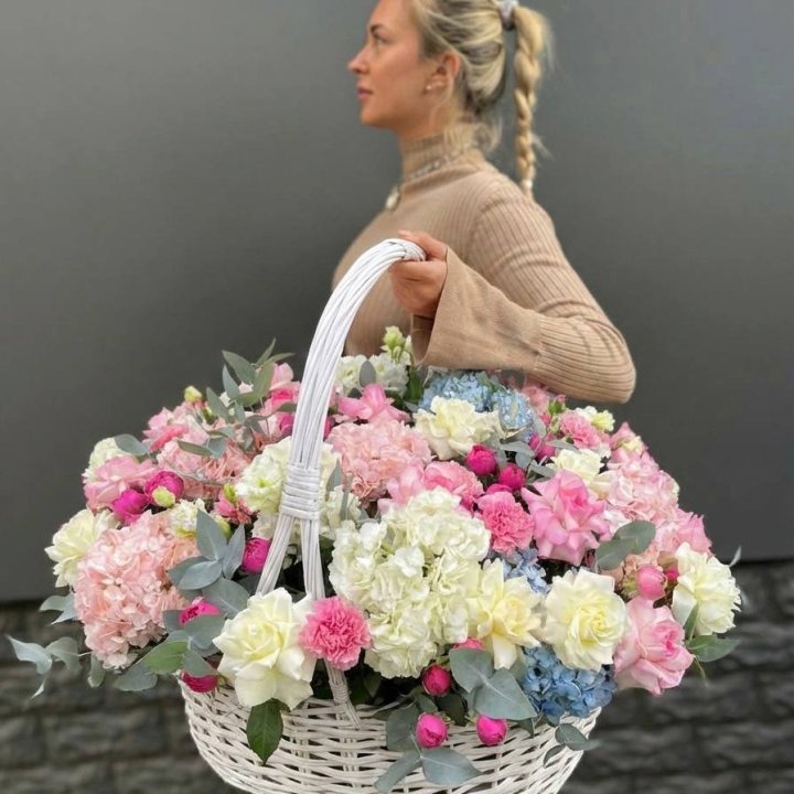 Садовая корзина — главный тренд последних лет. Свободная многовидовая аранжировка в плетёной корзине: эустома, ранункули, нигелла, зелень — ощущение только что срезанных цветов из загородного сада. Покупают те, кто устал от строгих классических форматов и ищет природной органики и лёгкости в подарке.